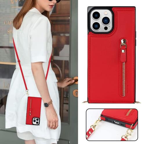 Cavor iPhone14 Proスマホケース肩掛け首かけ斜めがけスマホショルダーiPhone14 Proケース手帳型iPhone14 ProスマホカバーRFID機能iPhone14 Proケースカード収納マグネットダブルデザインiPhone14 Proスマホ携帯ケース横置付きの専属ストラップ同梱なので ファスナースタイル財布型 磁気機能- レッド