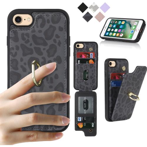 Cavor iPhone7 Plus/8 Plusケース 背面ポケット付きiPhone7 Plusケース 手帳型 iPhone8 Plus 手帳型ケース上下開折りたたみ iPhone8 Plus 携帯ケースRFID機能軽量 Qi急速充電対応 iPhone7 Plus case カード収納 横置 360°回転リング免許証とQi急速充電-黒ヒョウ柄