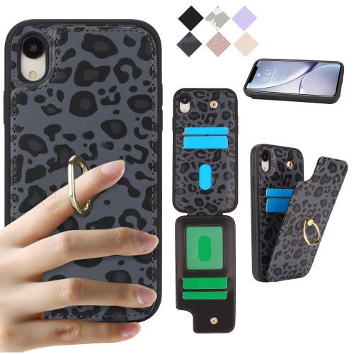 Cavor iPhoneXR 手帳型ケースiPhoneXR ケース背面ポケット付きiPhone10R ケースカードポケット上下開iPhone10Rスマホケース iPhoneXR 携帯ケースRFID機能iPhoneXR 財布型ケースiPhoneXR case 360°回転リング 可愛い横置 免許証と カード収納 Qi急速充電対応 落下防止-黒ヒョウ柄