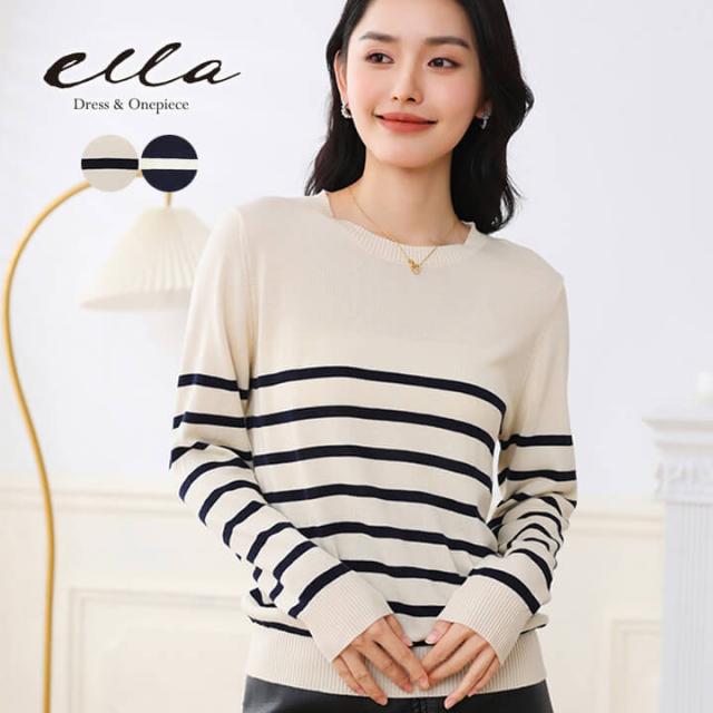 パネルボーダー ボートネック ニット レディース 春 秋 長袖 クルーネック トップス カジュアル 着痩せ 丸首 大きめ シルエット ゆったり 華奢見え シンプル ストレスフリー 無地 大人可愛い 大人カジュアル ロンT やわらか リラックス ミドル丈 10代 20代 30代 4