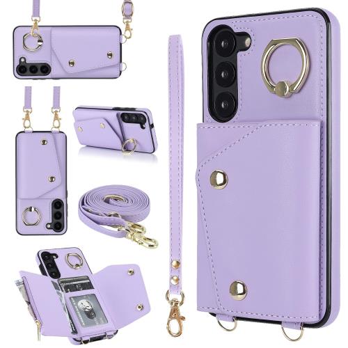 サムスンGalaxy S23 Plusケース 手帳型 PU革 カード収納 小銭入れ スマホカバー ギャラクシー S23 Plus 手帳型ケース 長ストラップ リング付き Galaxy S23 Plus 携帯カバー 肩がけ 首掛け 斜め掛け-パープル
