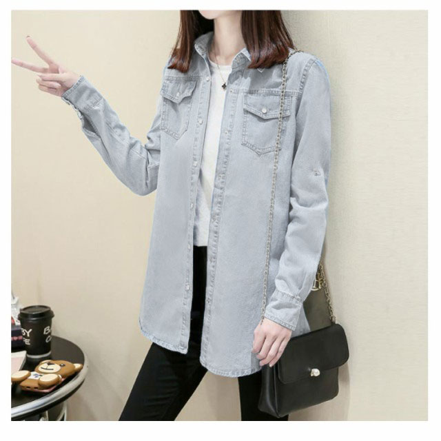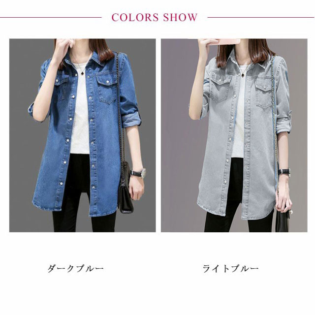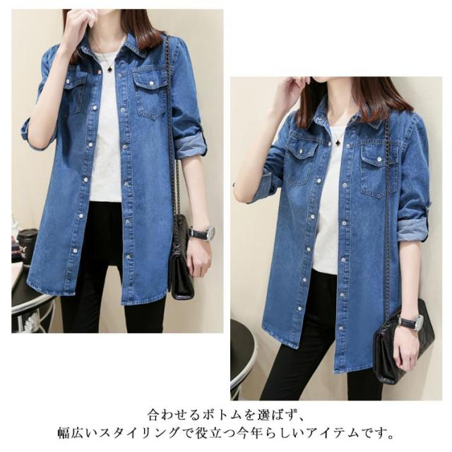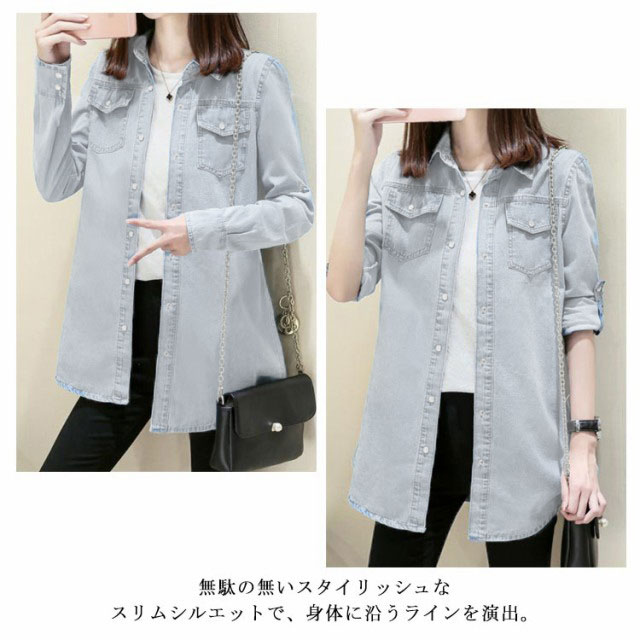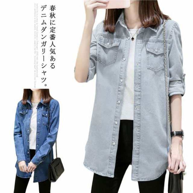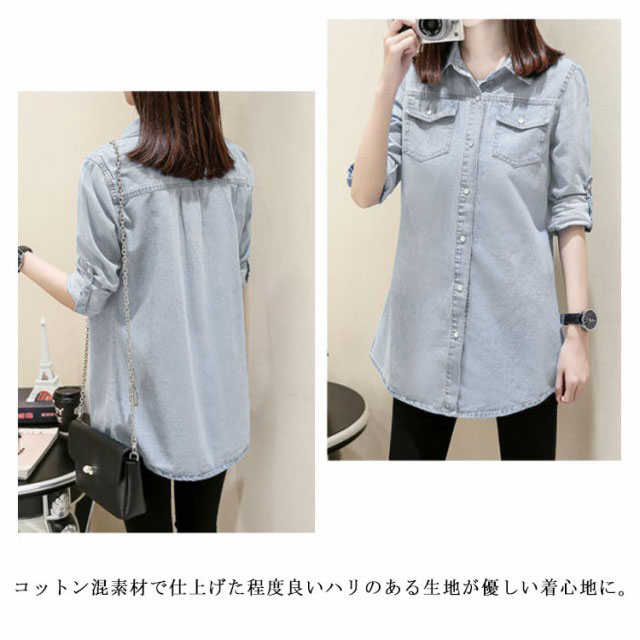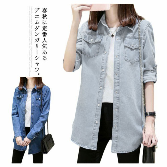 デニムブラウス ダンガリーシャツ レディース デニムシャツ デニム デニムブラウス シャツ ブラウス トップス カジュアル ロールアップ 長袖 春服 秋服 ロングシャツ