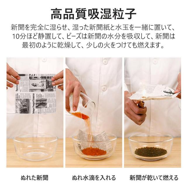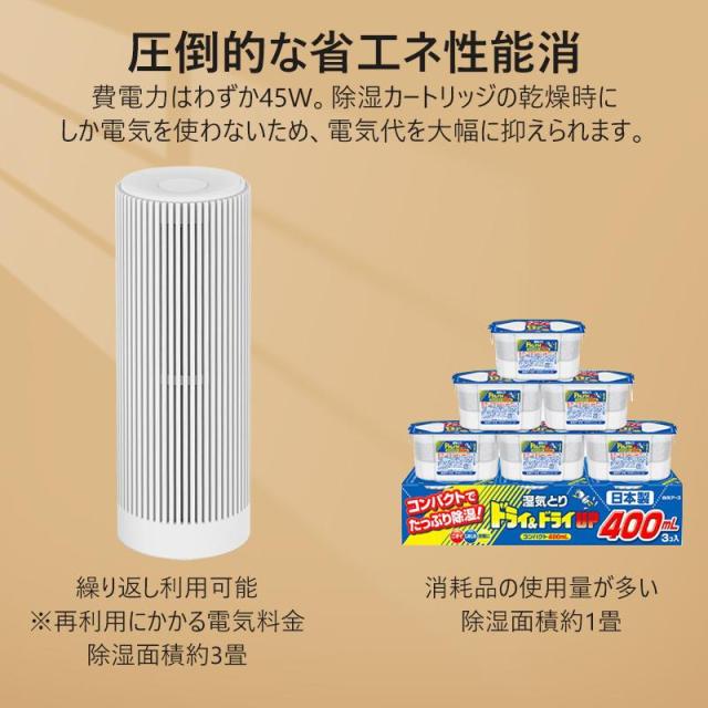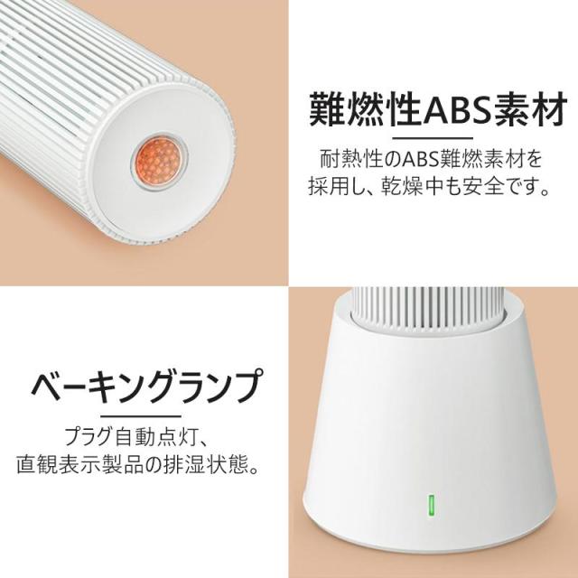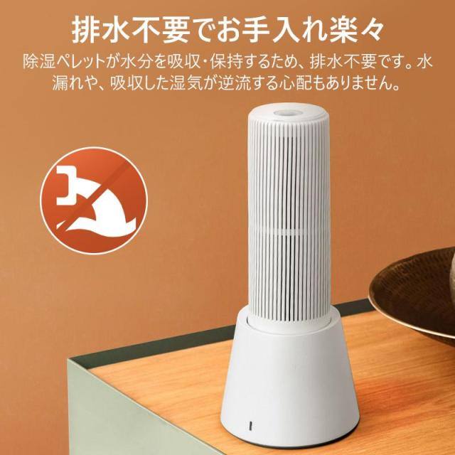 物理的な方法で湿気を取りため、電源不要で使用可能。除湿ペレットが飽和になったら、乾燥スタンドで温風を送風することで乾燥して吸湿力が戻る。