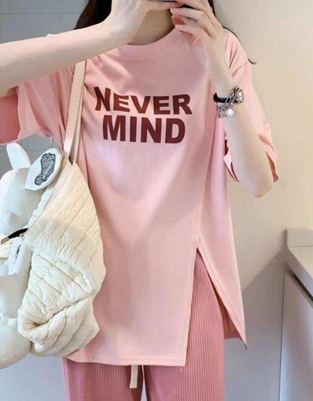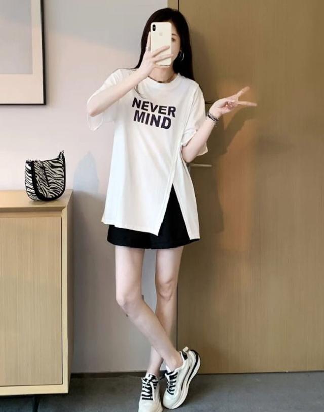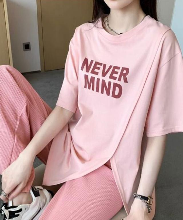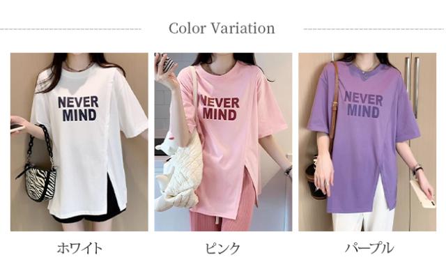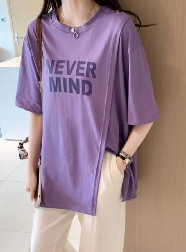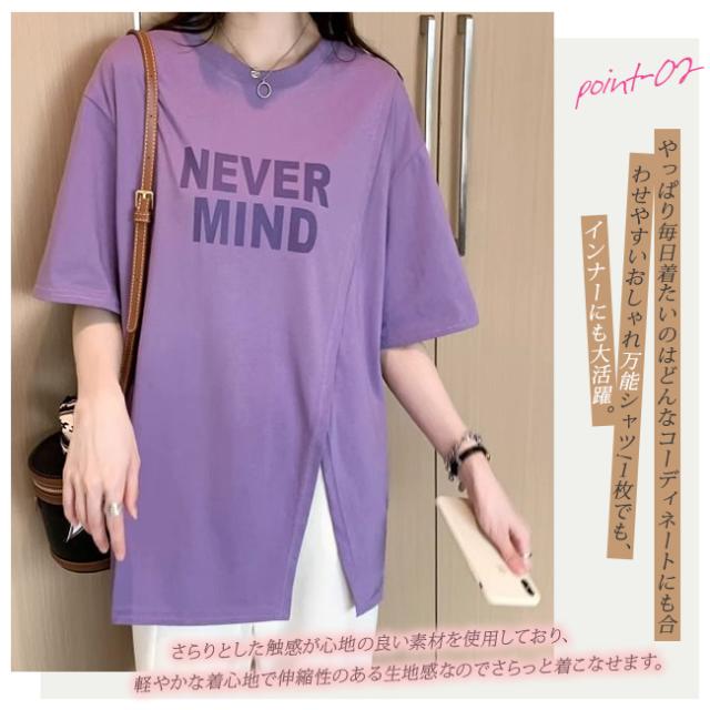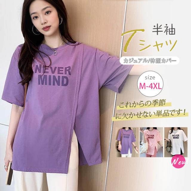半袖Tシャツ レディース tシャツ半袖 逆V裾スリット ロゴTシャツ 体型カバー トップス カットソー 春 夏 丸襟 大きいサイズ 丸首 薄手 通気性 透けない オシャレ カジュアル
