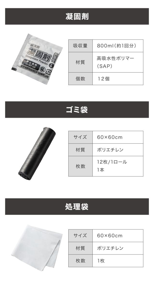 非常用トイレ本体:収納袋×1、ゴミ袋×12、凝固剤×12
