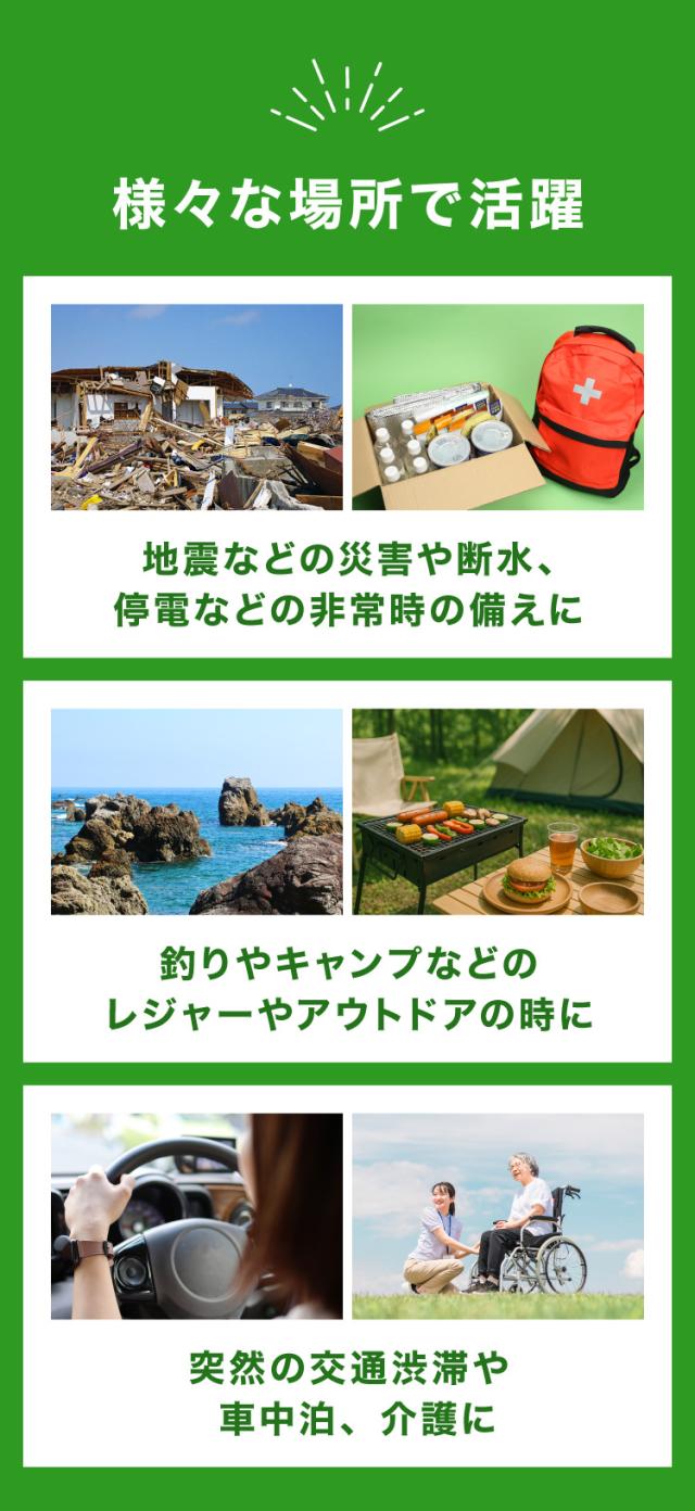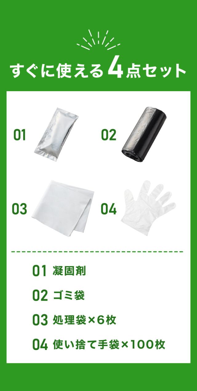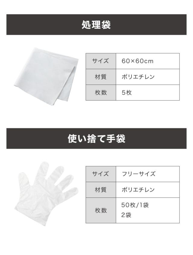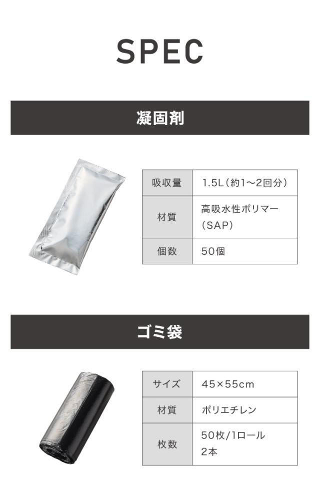 簡易トイレセット:使い捨て手袋×100、処理袋×5、ゴミ袋×100、凝固剤×50