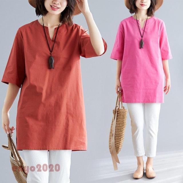シャツ ブラウス 半袖 チュニック ロングシャツ レディース ロング 夏 トップス リネン 無地 体型カバー ゆったり プルオーバー 30代 40代 大きいサイズ