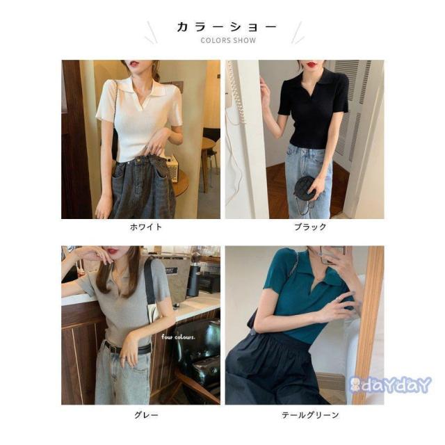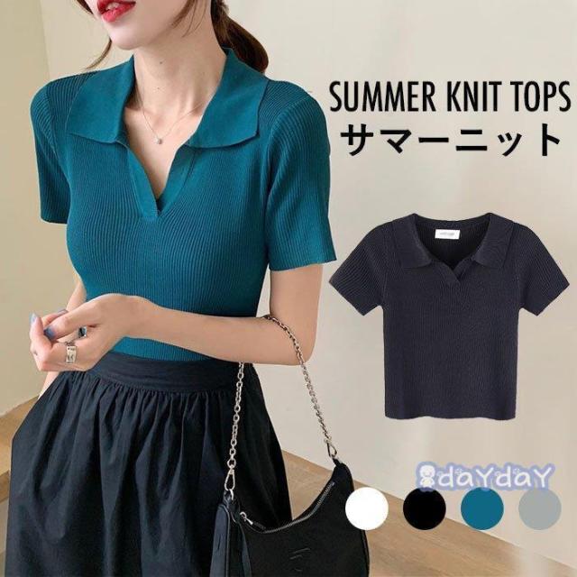 サマーニット レディース リブニット ニット リブ 半袖 夏ニット ニットトップス 折り襟 ショートニット 薄手 薄手ニット ショート丈