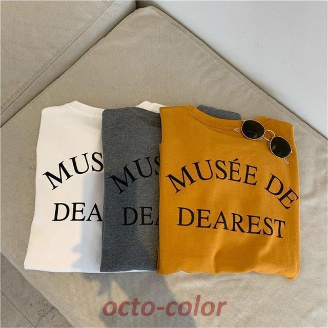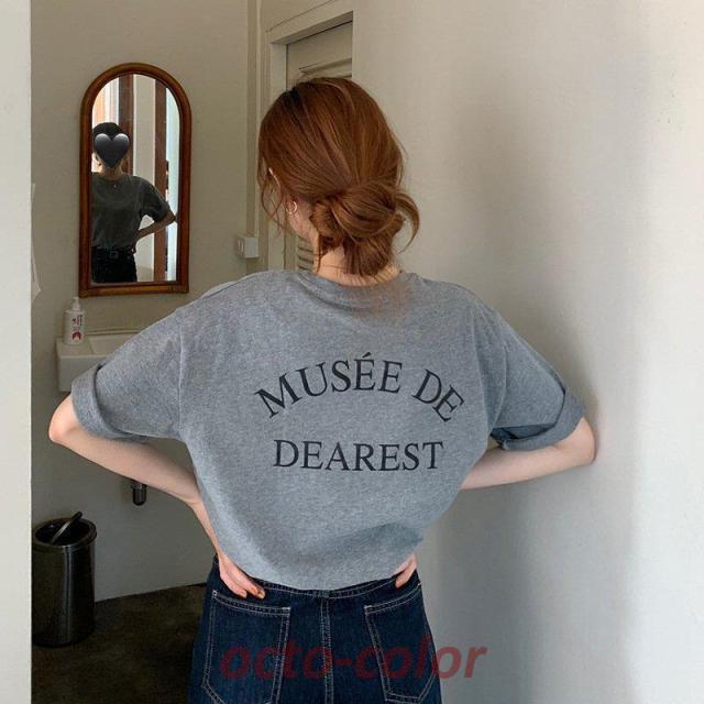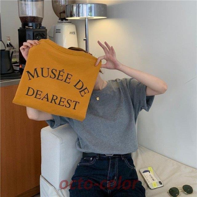 tシャツ レディース 夏 半袖 韓国 ロゴ カットソー Uネック トップス ゆるTシャツ 丸首 プルオーバー カジュアル グレー 白 イエロー プリント