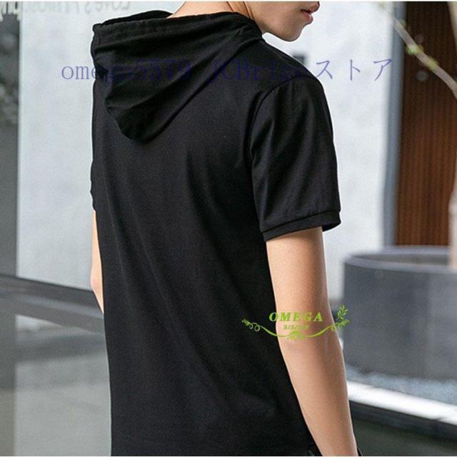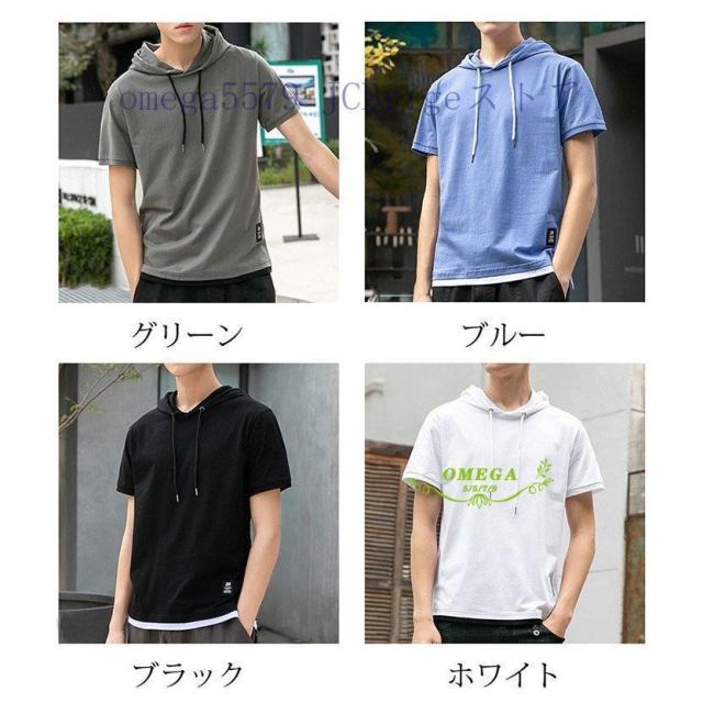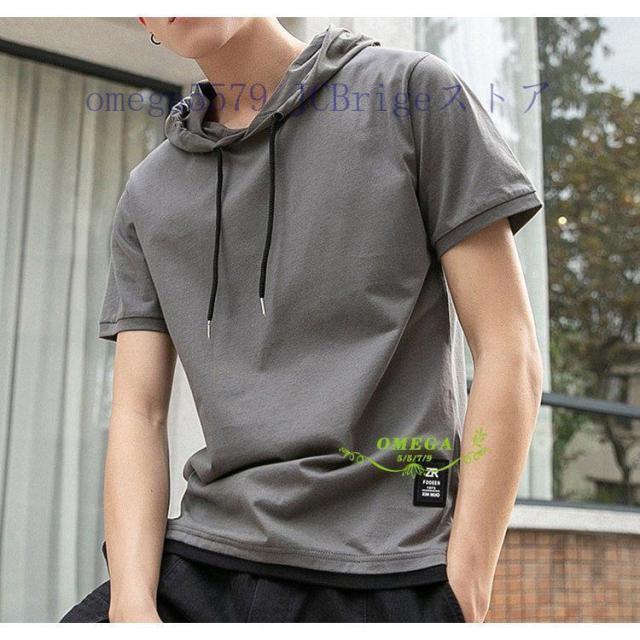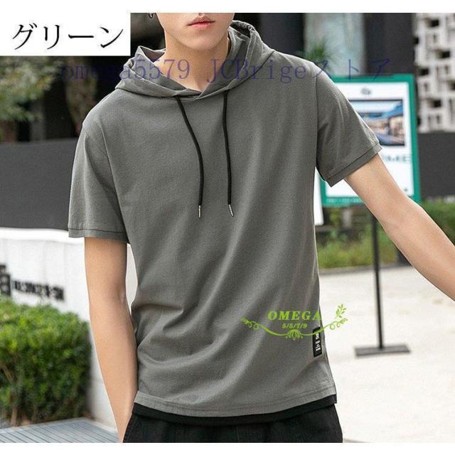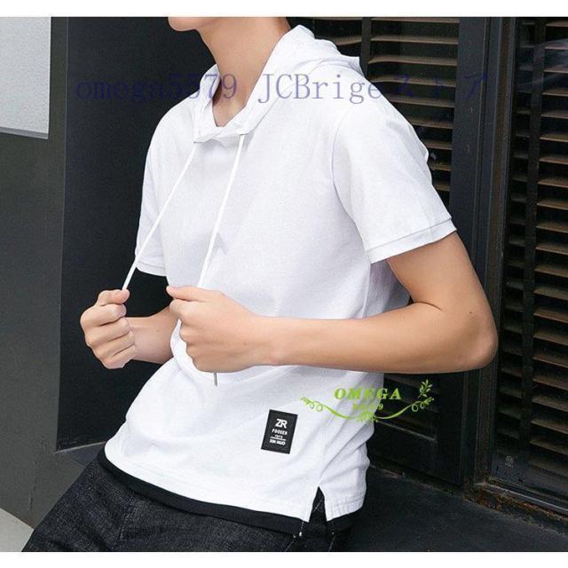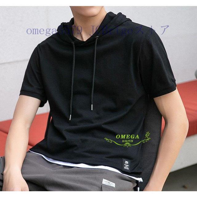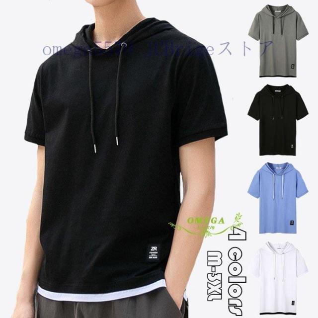 パーカー メンズ おしゃれ スウェット プルオーバー 半袖 重ね着風 トップス フード付き カジュアル フェイクレイヤード Tシャツ 夏 20代30代40代 4色 お兄系
