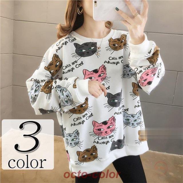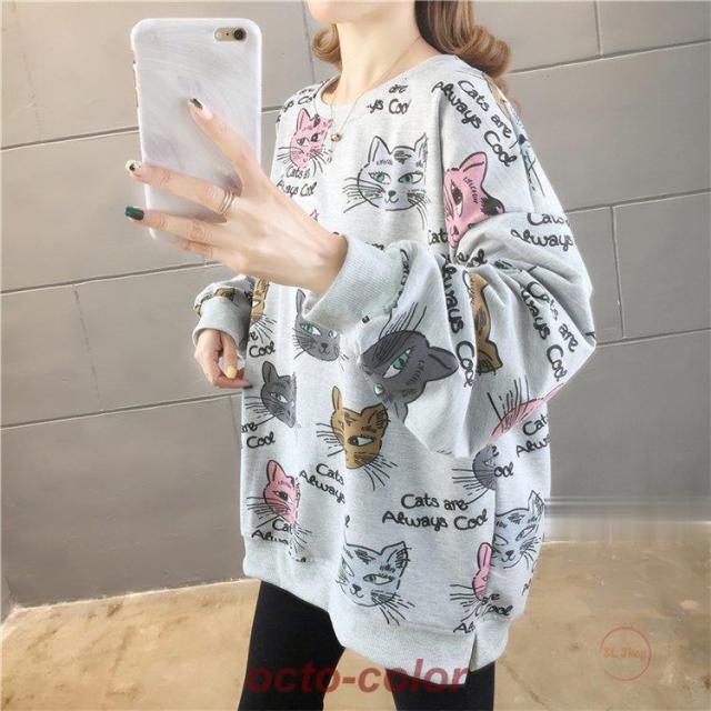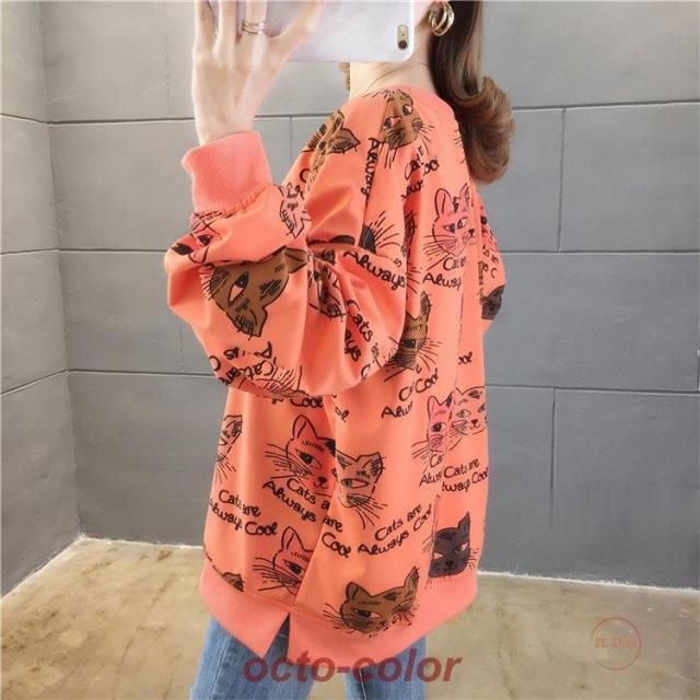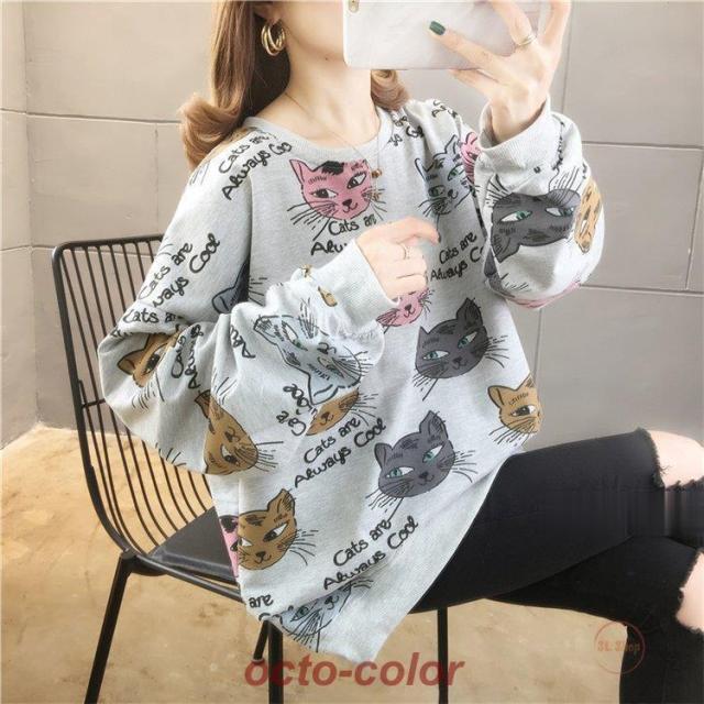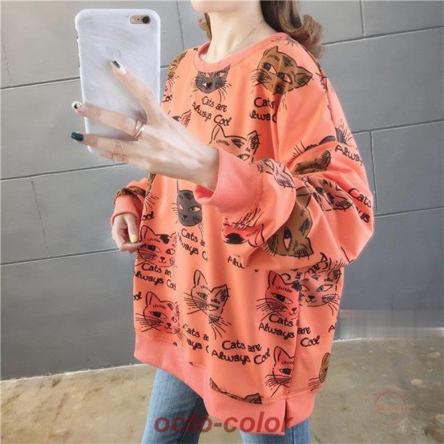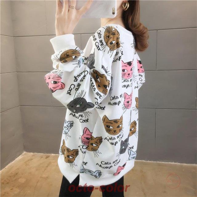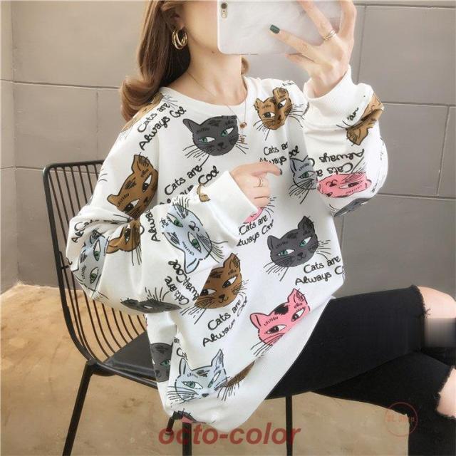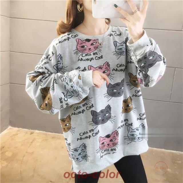 トレーナー レディース 薄手 tシャツ 猫柄 カットソー ビッグtシャツ 英字 トップス 2020秋冬 サイドスリット