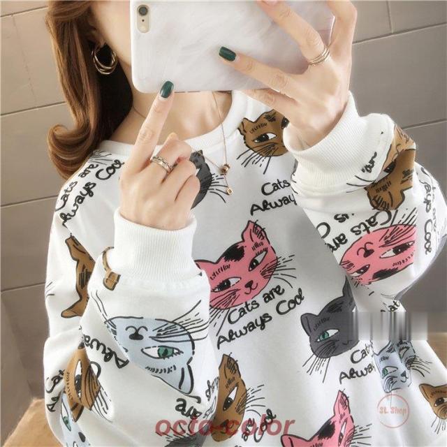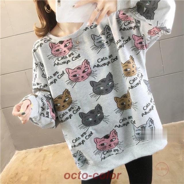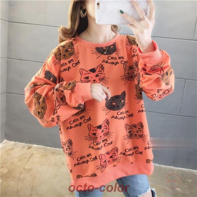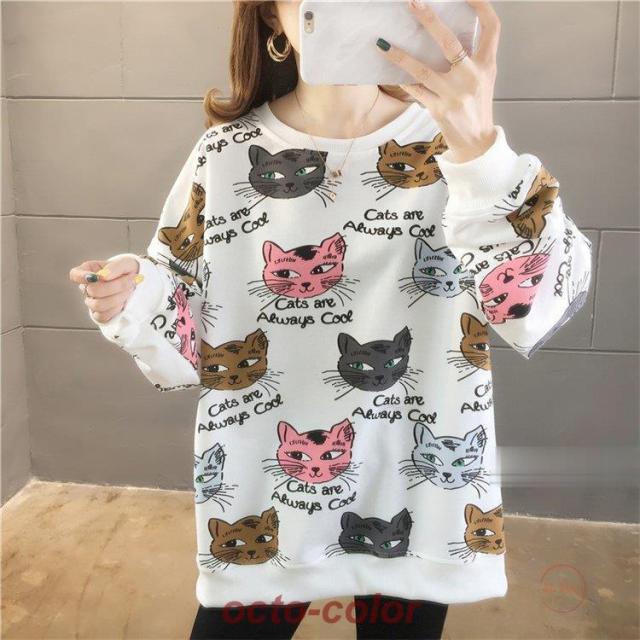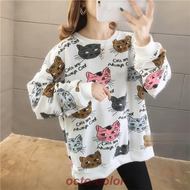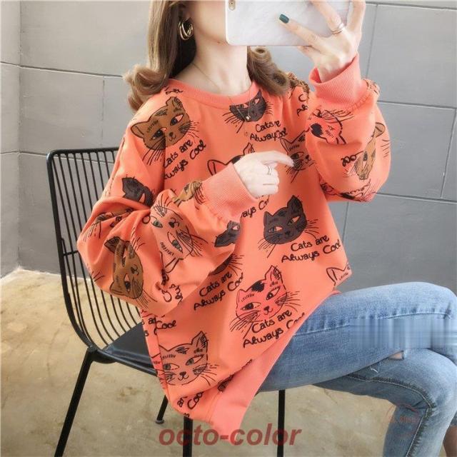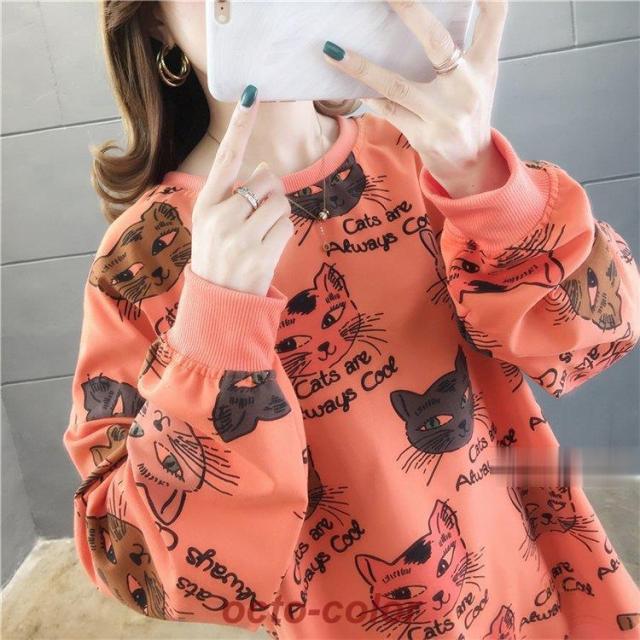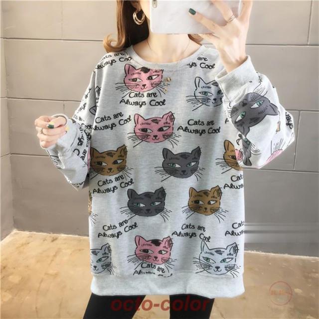 トレーナー レディース 薄手 tシャツ 猫柄 カットソー ビッグtシャツ 英字 トップス 2020秋冬 サイドスリット