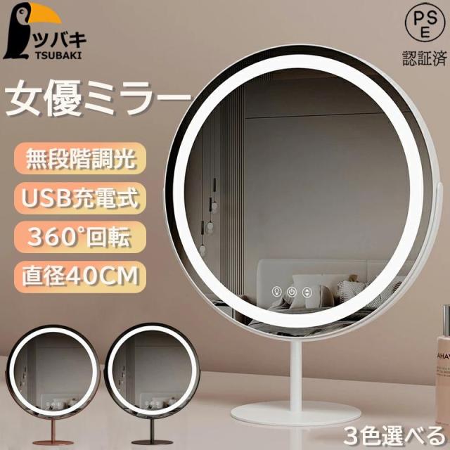 卓上ミラー ledライト付き 大きい円形 USD充電式 三色調光 角度調整 明るさ調整 LED化粧鏡 女優ミラー メイクミラー 卓上鏡 プレゼント 新生活