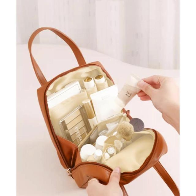 大きく開いて中身が一目瞭然で整理整頓しやすい、しっかり自立する縦型の韓国風新作化粧品収納バッグ