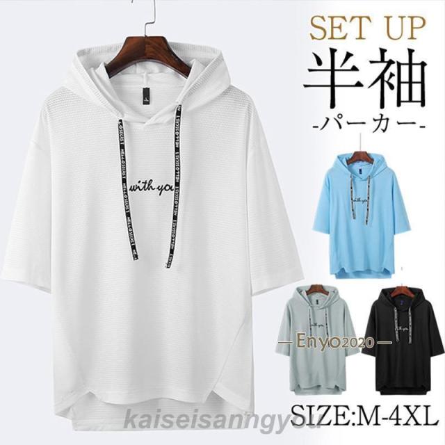 パーカー メンズ Tシャツ 五分袖 夏 メンズファッション 特集 M L XL 2XL 3XL 4XL ブルー グレー ブラック ホワイト