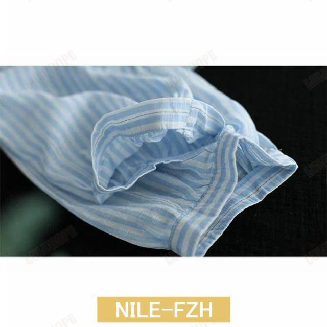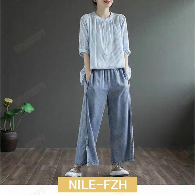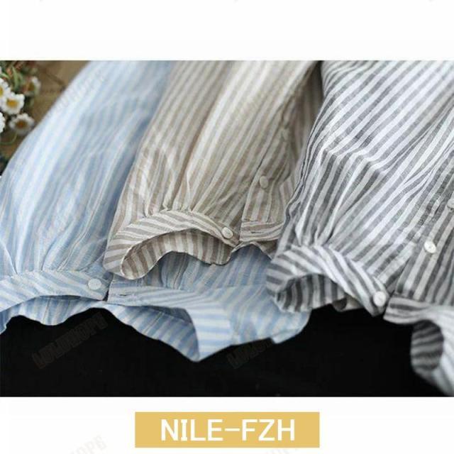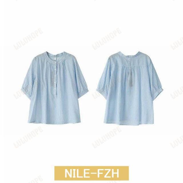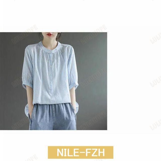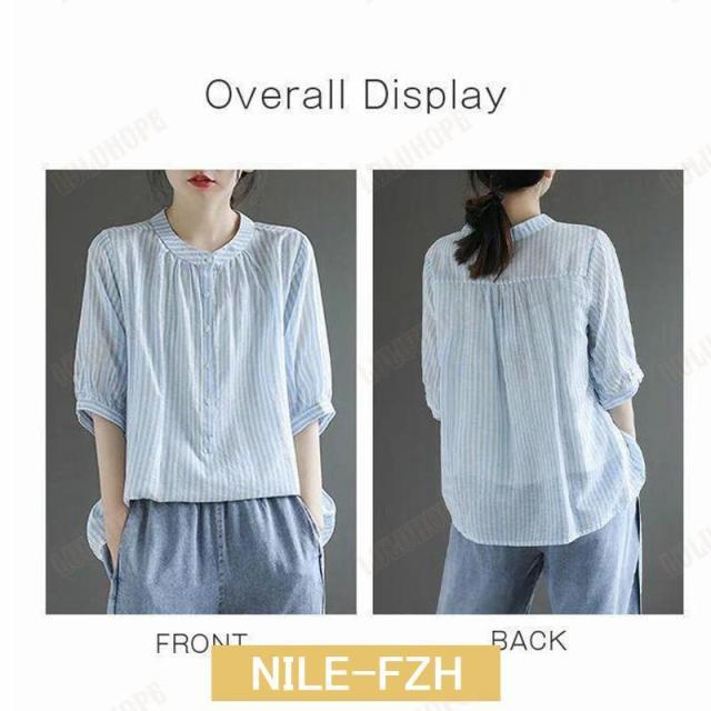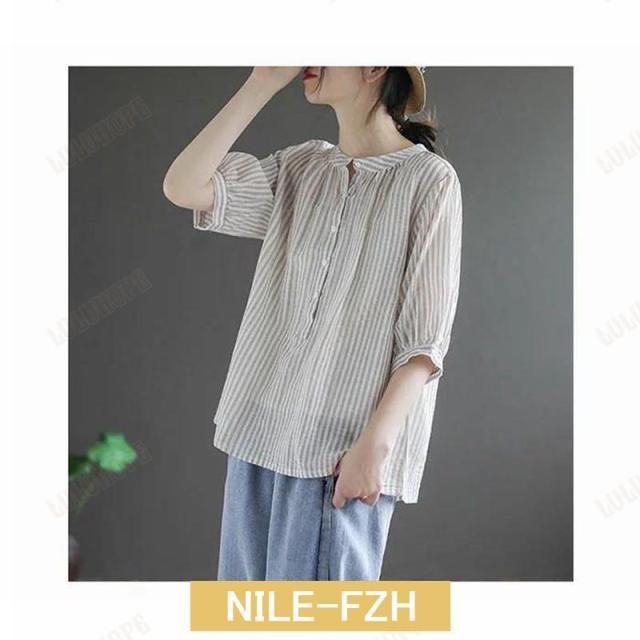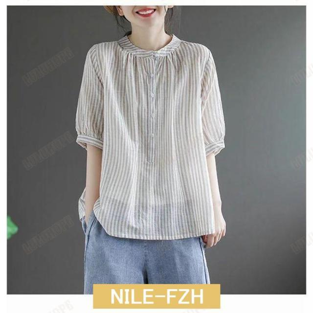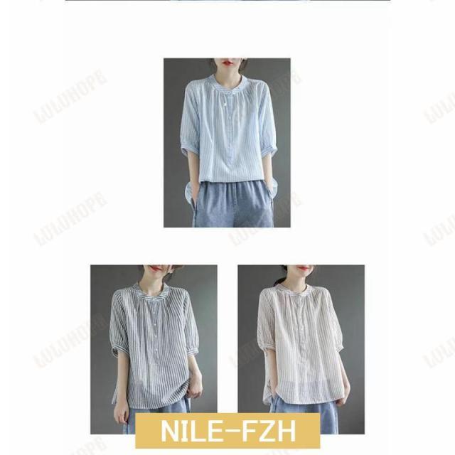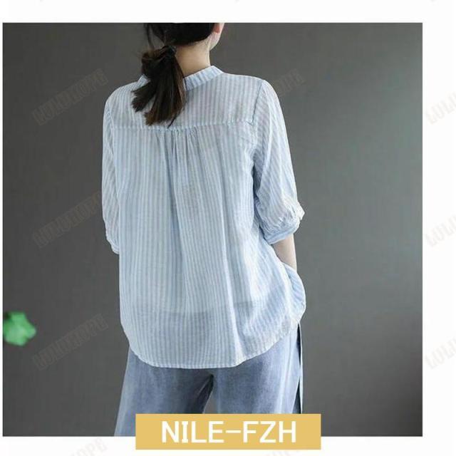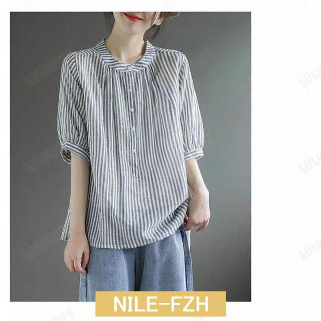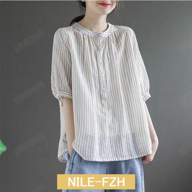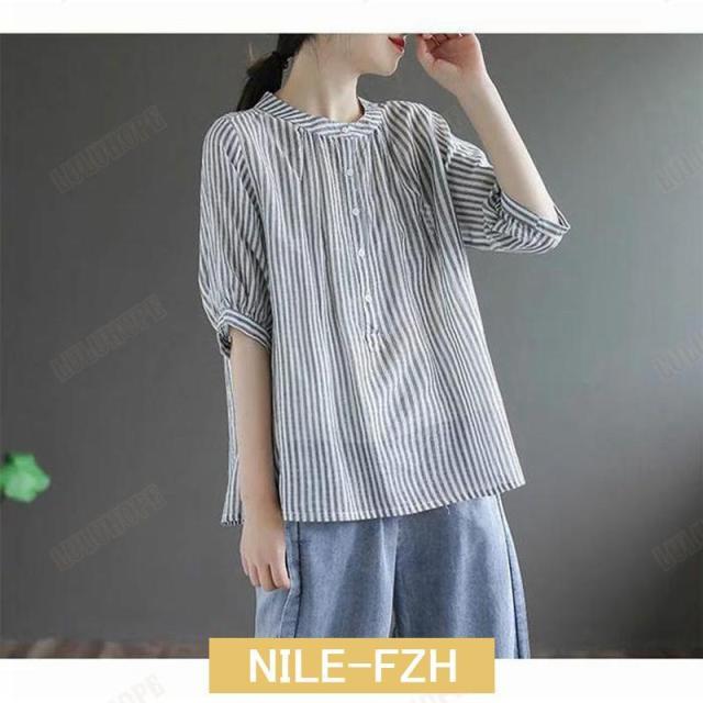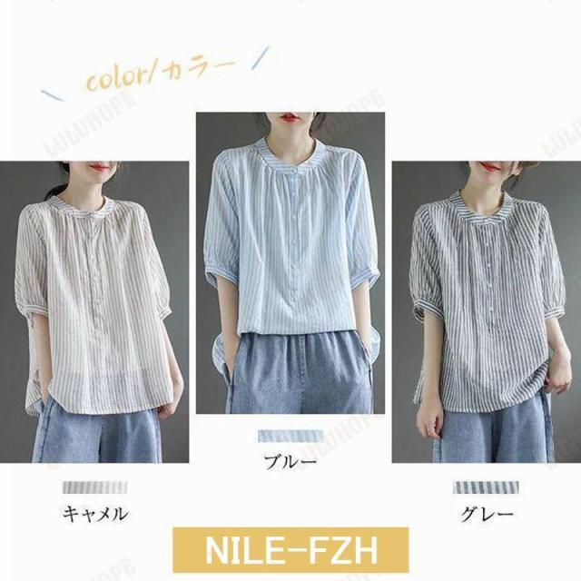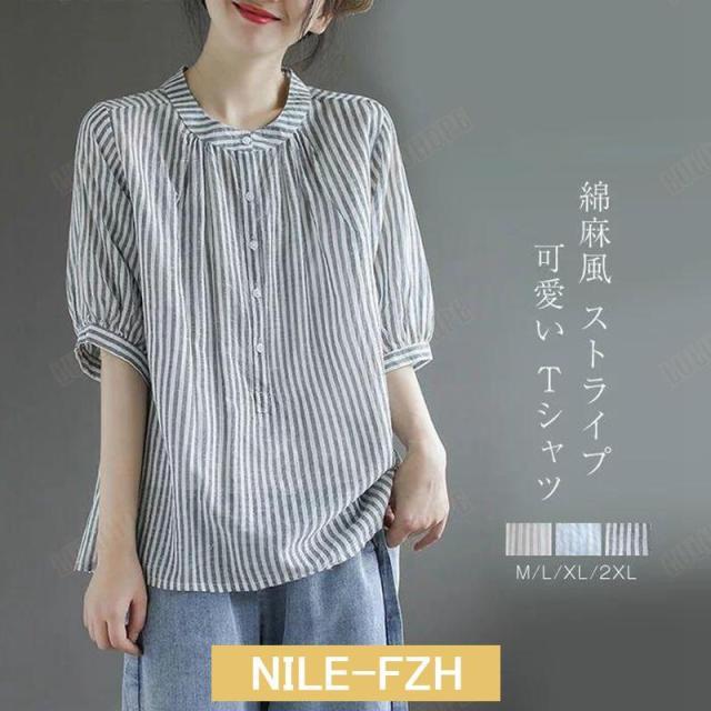 綿麻風 シャツ ブラウス レディース 半袖 夏 シャツブラウス クルーネック 薄手 ストライプ 大きいサイズ ヘンリーネック 体型カバー 可愛い