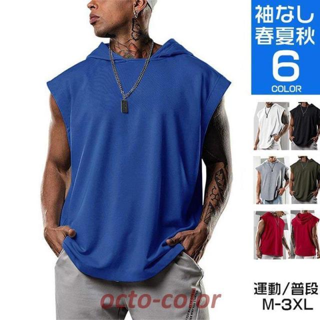 パーカー メンズ ノースリーブ 袖なし トップス Tシャツ カットソー 特集 ホワイト レッド グレー グリーン ブラック ブルー M L XL 2XL 3XL