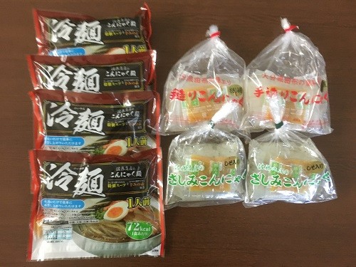 内容量;冷麺×4袋、しそ入り刺身こんにゃく×2袋、手造りこんにゃくお刺身用×2袋
