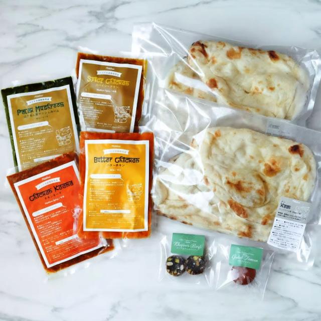内容量;*お好きなカレー×4種(各1袋)6種類からお選びください「・バターチキン(甘口)・ほうれん草マッシュルーム(ピリ辛)・チキンキーマ(中辛)・スパイシーチキン(中辛)・ブラックペッパーチキン(辛口)・マトン(辛口)」*ナン(2枚入り)×2袋*デーツ&ナッツバルフィ(2個入り)×2袋*グラブジャムン(1個入り)×1袋