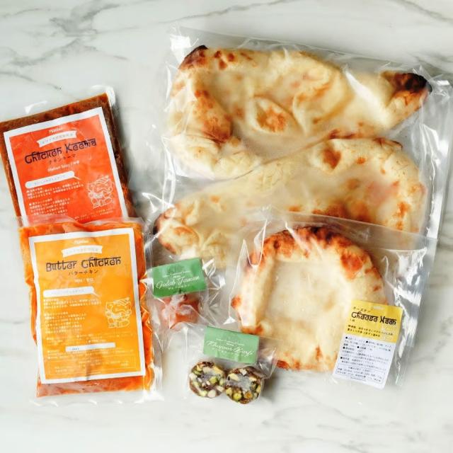 インドカレー2種、ナン1袋、チーズナン1袋、インド菓子2種が入ったお試しセットです♪
