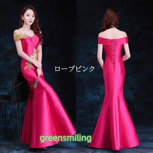 カラードレス ロングドレス マーメイドドレス オフショルダー ウェディングドレス 結婚式 二次会 花嫁 ゴールド レッド パープル ブルー グリーン ロープピンク