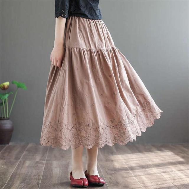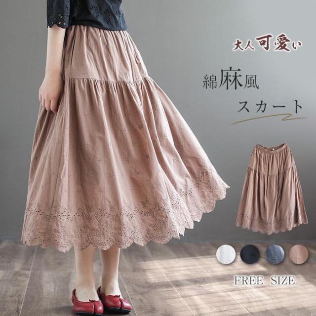 ロングスカート Aラインスカート ボトムス レース ロング丈 ミモレ丈 春 夏 秋 冬 レーススカート レース刺繍 裏地 コットンリネン ポ ギャザー