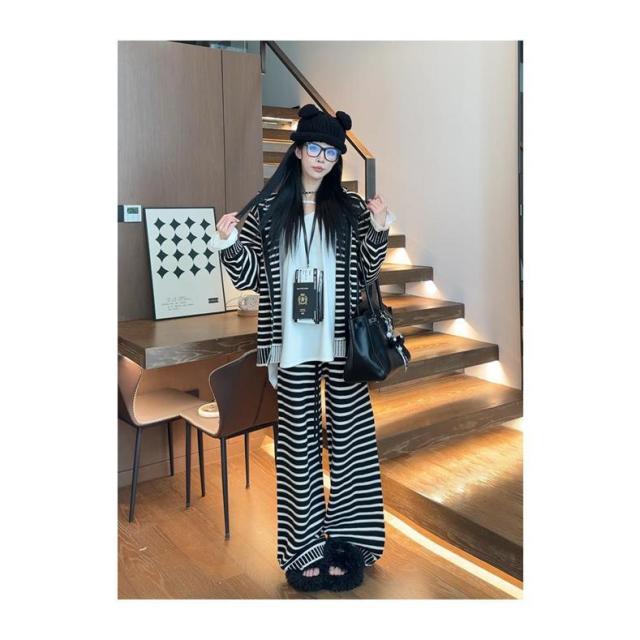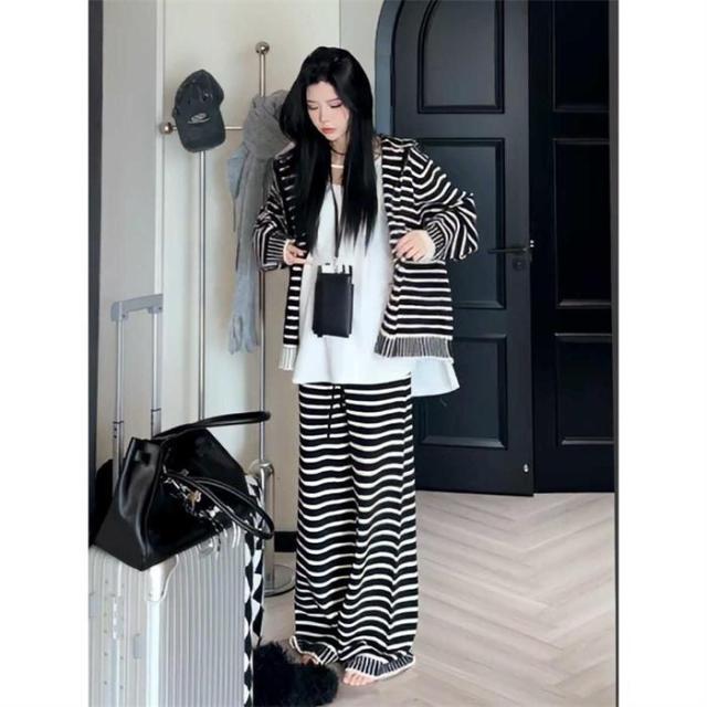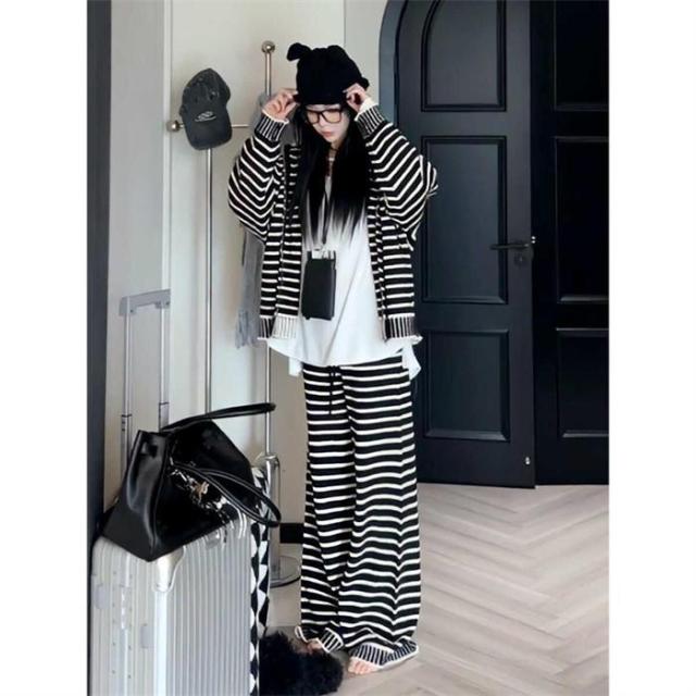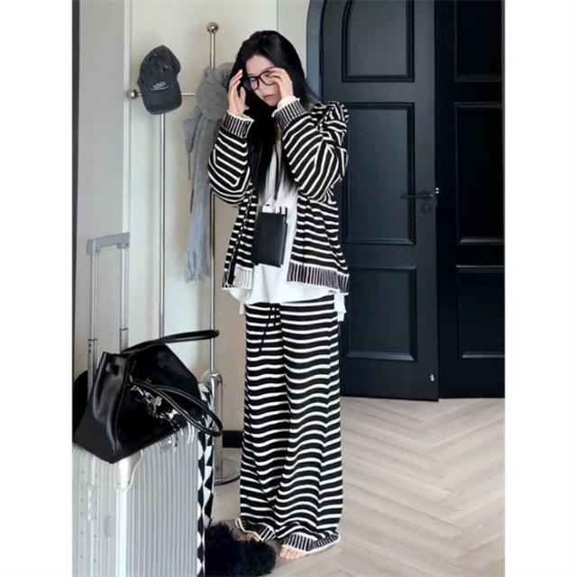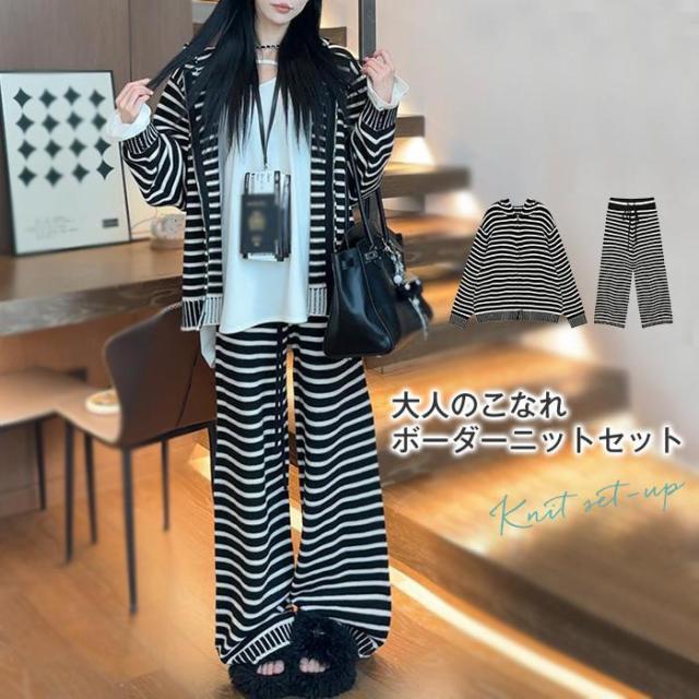 セットアップ レディース カジュアル 秋冬 きれいめ バーダー ニット 上下セット パンツスーツ 重ね着 2点セット トップス アウター フード付き パ カーディガン