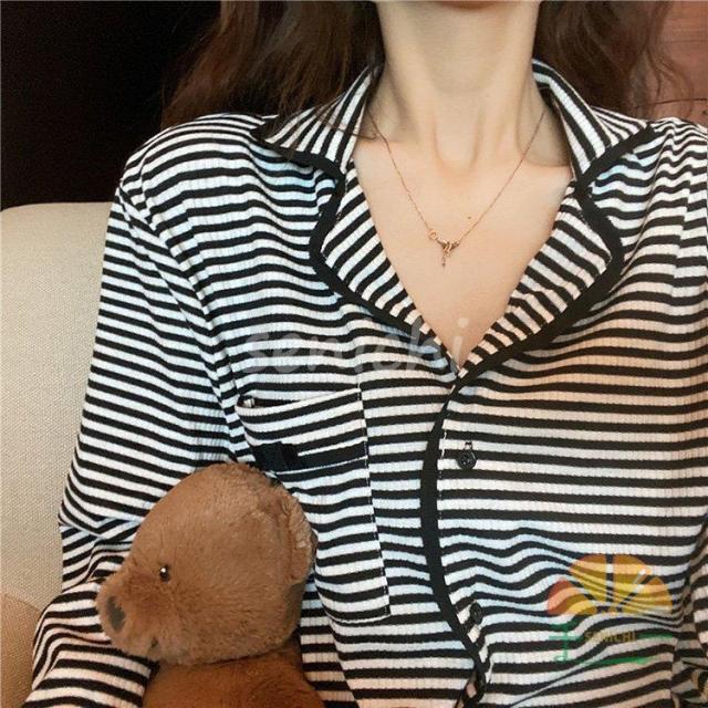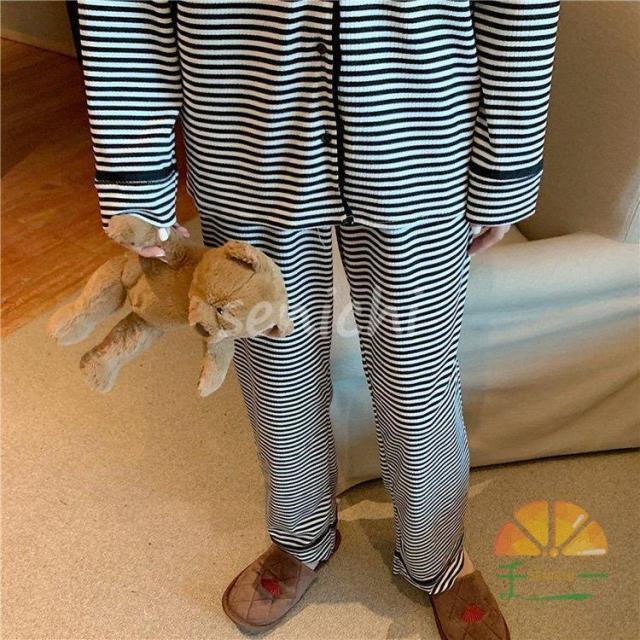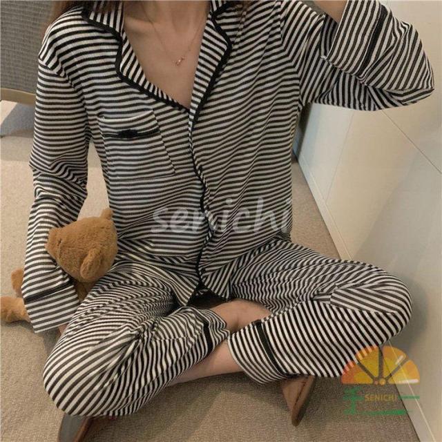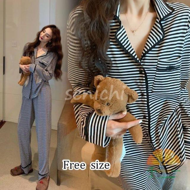 パジャマ レディース 春 秋 長袖 ロングパンツ ルームウェア ボーダー 上下セット 前開き 部屋着 韓国風 寝巻き 可愛い