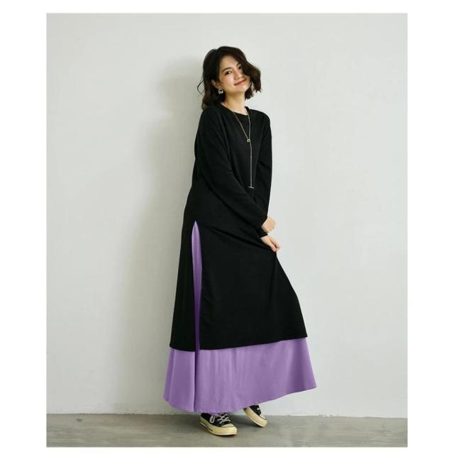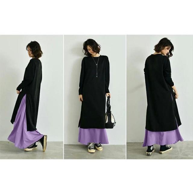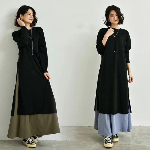 ワンピース ロングワンピース 2点セット レイヤード インナースカート Tシャツカットソー レディース サイドスリット Tシャツワンピ 長袖 クルーネ カットソー