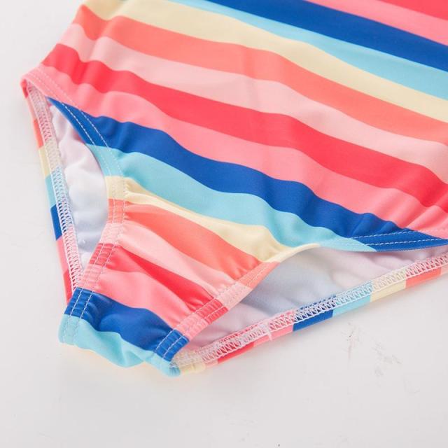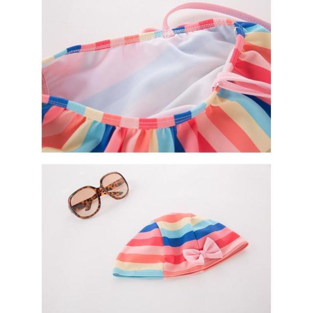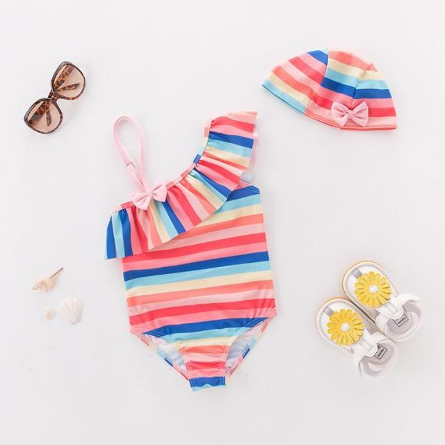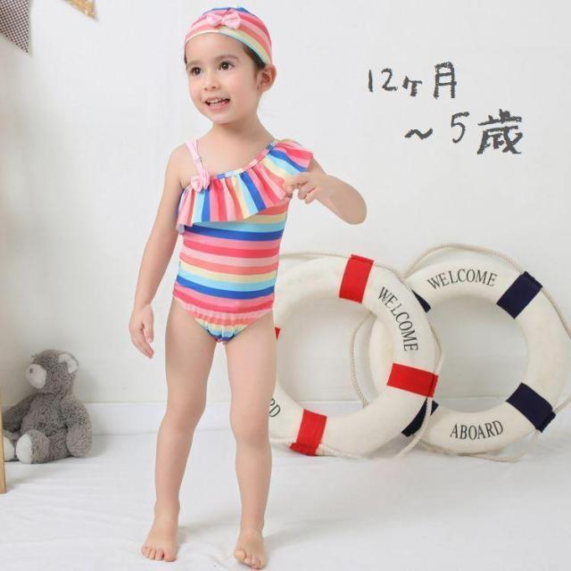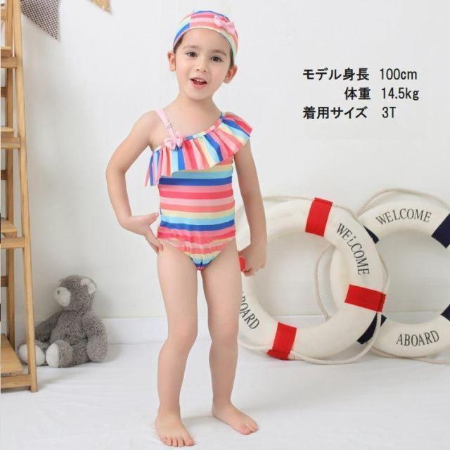 水着 スイムウェア 子供用 キッズ ベビー 女の子 2点セット ワンショルダー オフショルダー フリル リボン カラフル かわいい 水泳帽付 ボーダー