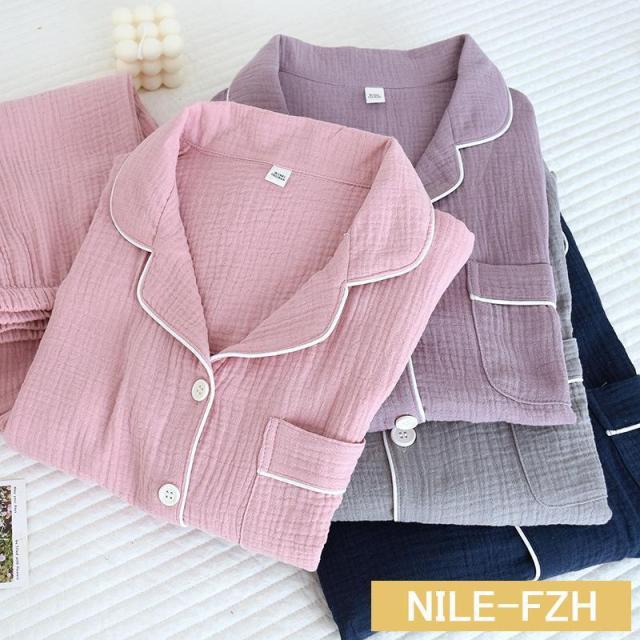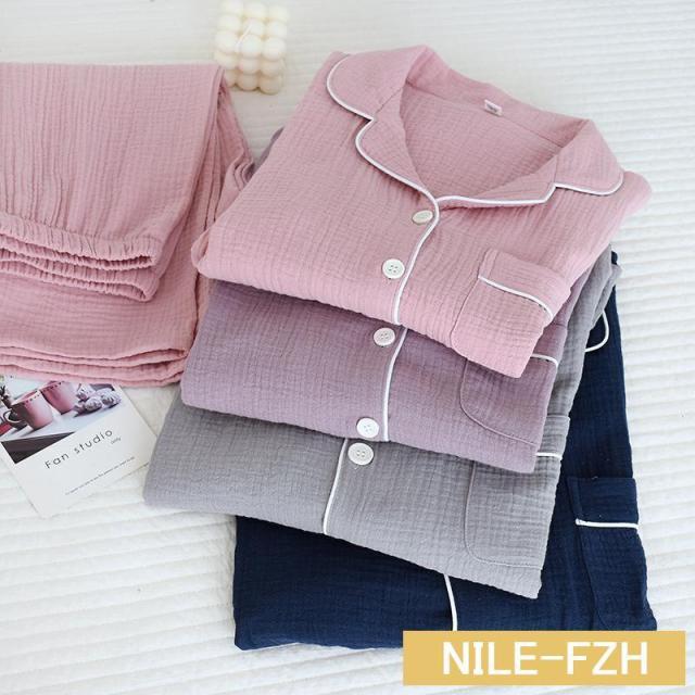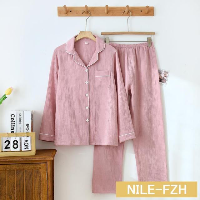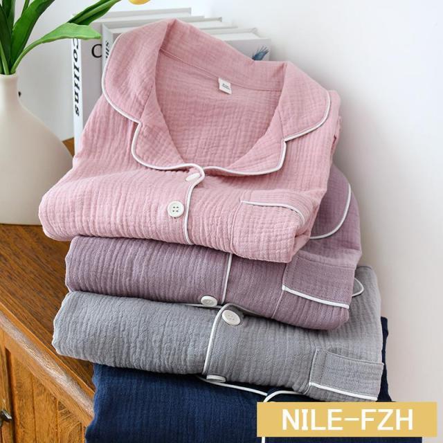 ペアパジャマ ガーゼパジャマ ダブルガーゼ 二重ガーゼ ルームウェア 襟付き綿100%ガーゼ 前開き 敏感肌用 部屋着 春夏秋冬用 長袖長ズボン上下セット