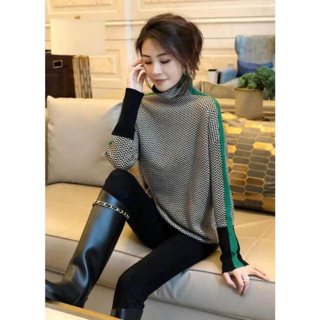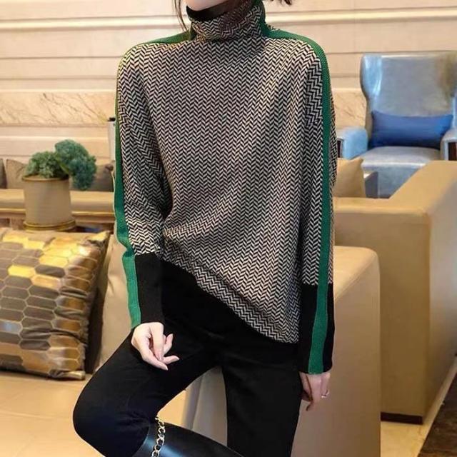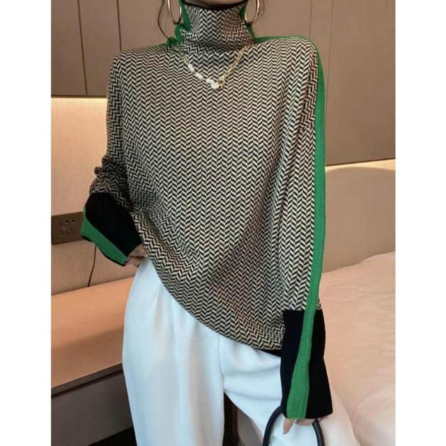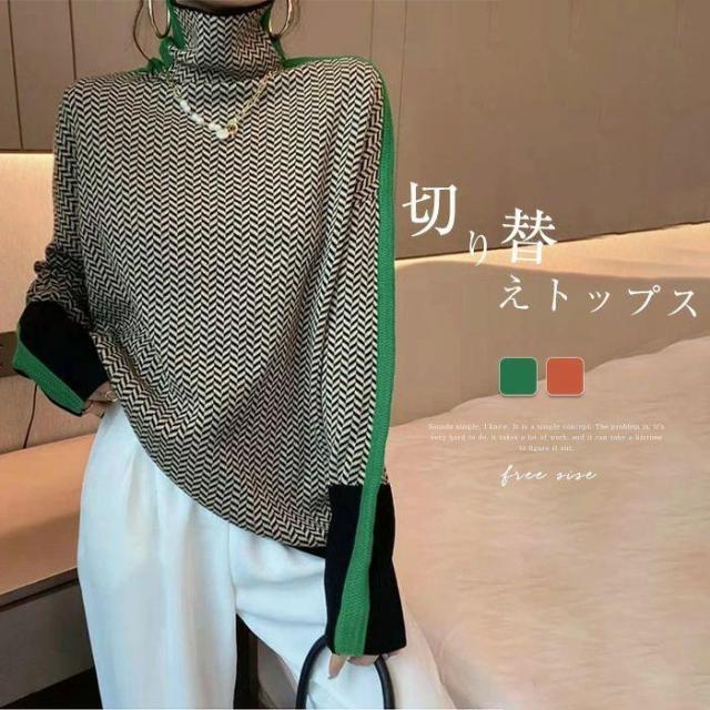 トップス レディース 長袖 ハイネック レディースファッション 超目玉商品 グリーン+ボーダー オレンジ+ボーダー グリーン+チェック オレンジチェック