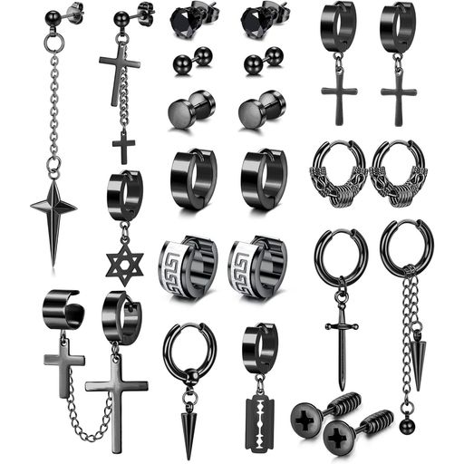 【メンズピアス】この男性用パンクピアスセットには、サークルピアスフープ3ペア、ダングルフープクロスピアス1ペア、異なる形状のピアススタッド4ペア、ダングルフープピアス3個、ダングルチェーンピアス3個が含まれています。さまざまな形のさまざまなピアスをさまざまな服と組み合わせて、あらゆる着用ニーズに対応できます。