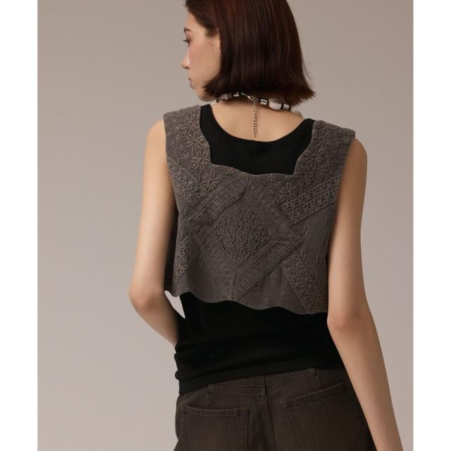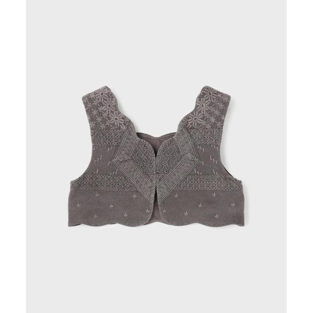コーディネートが華やぐ、BOHOスタイルにぴったりなショートジレ。シボ感・表面感のあるコットン地に、オリジナルの刺繍をたっぷりと施した贅沢仕様の一枚。ピグメント染めをすることで、独特の風合いやヴィンテージ感を出しています。縁をスカラップ仕立てにした凝ったお作りで、着た時の可憐な表情が印象的。旬な短めの着丈バランスで、ボリューミィなスカートやワイドパンツとも相性良く合わせていただける一枚に仕上げました。