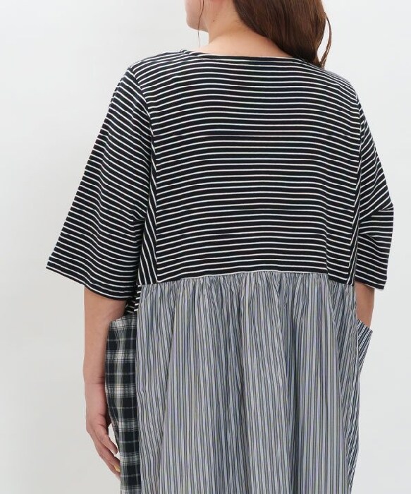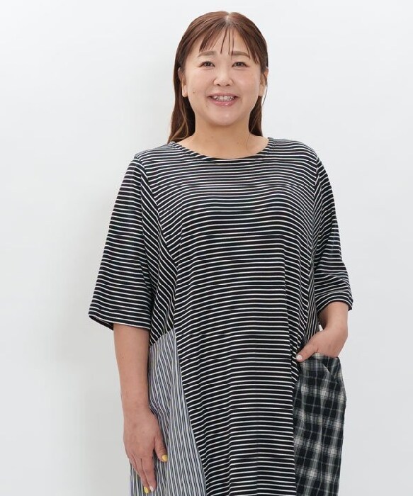 ボーダーの布帛とカットソー素材を組み合わせて、着心地と動きやすさを確保して重くなりすぎないようにしました。
