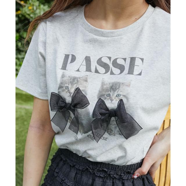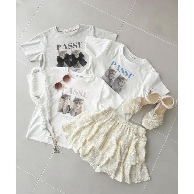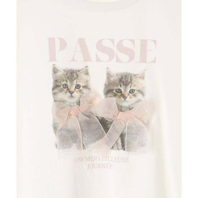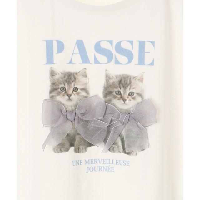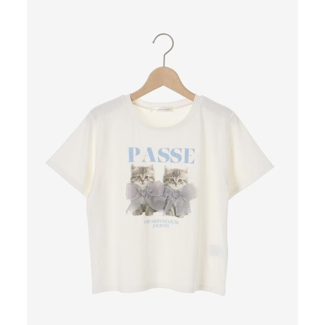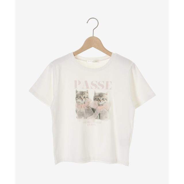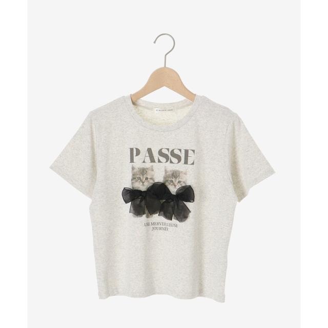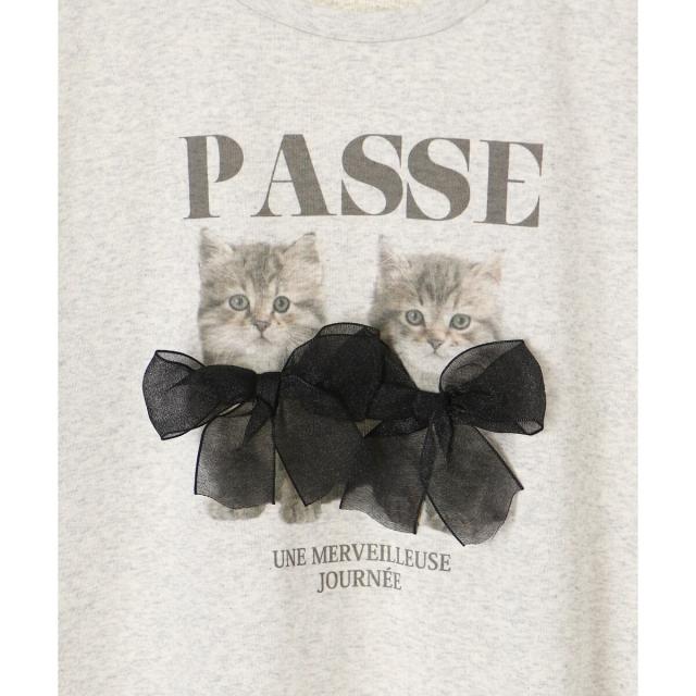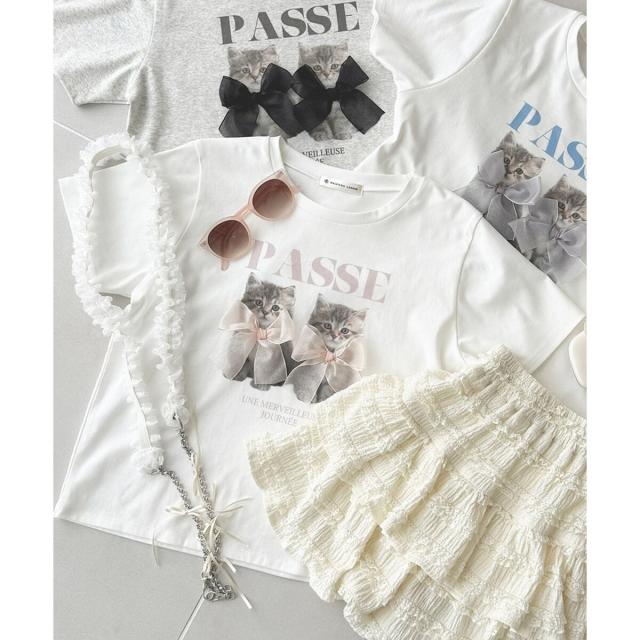 フロント部分にプリントされた猫ちゃんに、大きなオーガンジーリボンがとってもガーリーな一枚です。