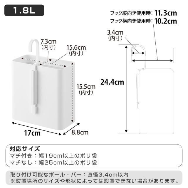 | サイズ | 内寸:約 幅15.6×奥行7.3×高さ15.5(cm) 幅17×奥行11.3×高さ24.4cm(フック縦向き使用時) 幅17×奥行10.2×高さ24.4cm(フック横向き使用時) |