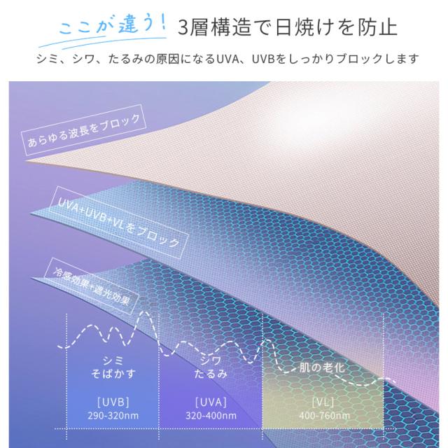 UPF50+のUVカット加工が施された3層構造の生地でシミ、シワ、たるみの原因となるUVA、UVB、VLからしっかり肌を守ります。