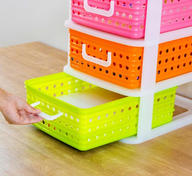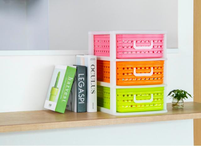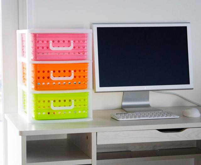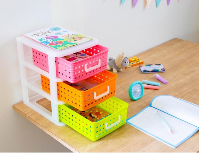 ビタミンカラーの収納ケースは、子供部屋の卓上整理にも最適です。散らかりがちな文房具、教材、プリント類などを分けて整理しておけます。カラフルな引き出しは、片付ける場所を決めやすいので、自分自身で整理整頓しやすくなり、忘れ物やプリントの紛失などの防止にもなります。