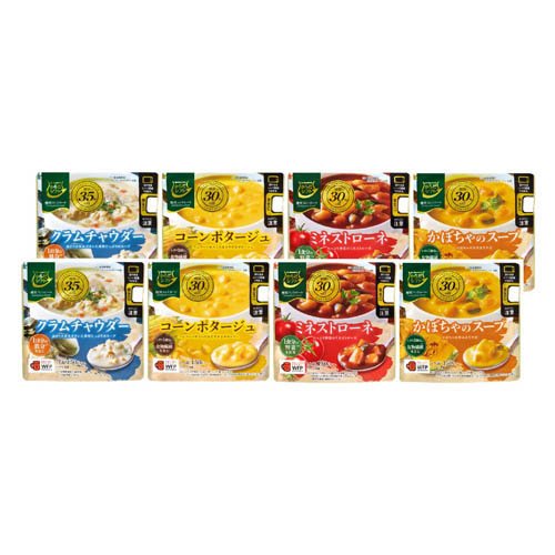 | クラムチャウダー:150g×2、コーンポタージュ:150g×2、ミネストローネ:150g×2、かぼちゃのスープ:150g×2 計4種8袋 |