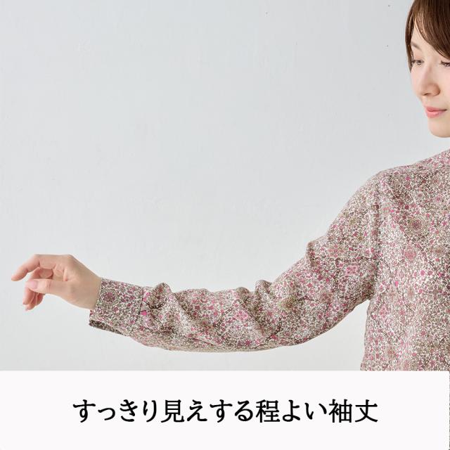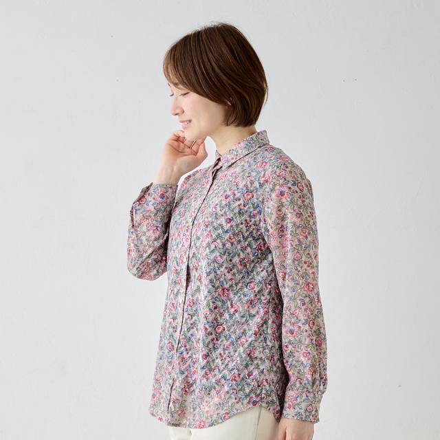 やわらかな色使いの花柄が女性らしさを引き立てるブラウス。