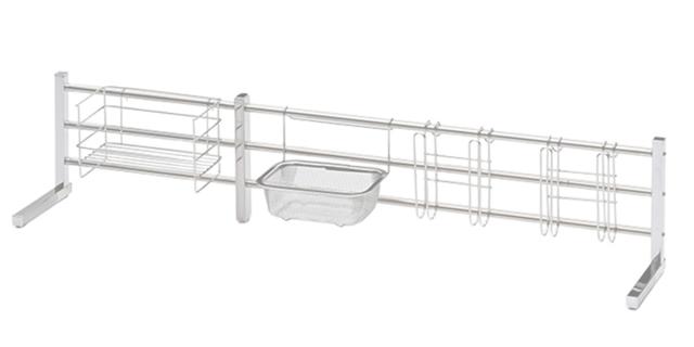 シンク奥に、キッチンアイテムがまとめられるマルチラックです。シンク周りが片付き、作業スペースが広がります。シルバーカラーのシンプルなデザインは、どんなキッチンにも自然に溶け込み、空間の雰囲気を損ないません。