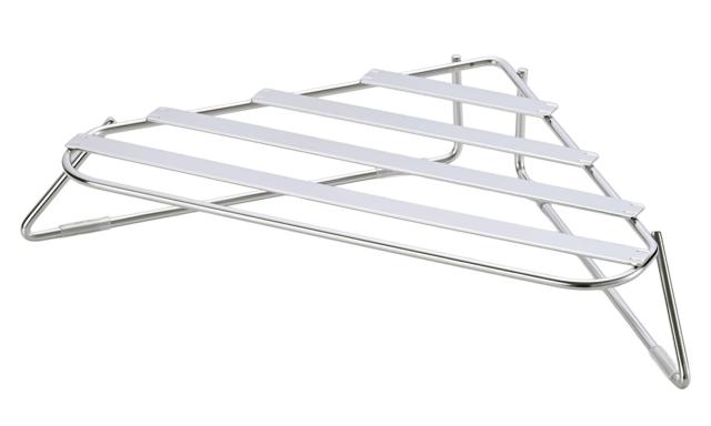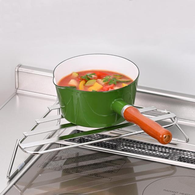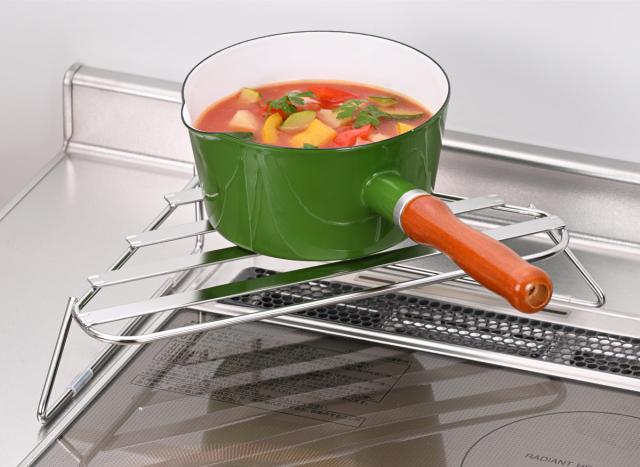 コンロ奥に設置するだけで、お鍋やフライパンの一時置きに便利なコーナーラックです。排気口をふさがずに設置でき、調理直後の熱いお鍋も安心して置くことができます。油やスパイスなど使用頻度の高いアイテムを置くのにも活躍します。