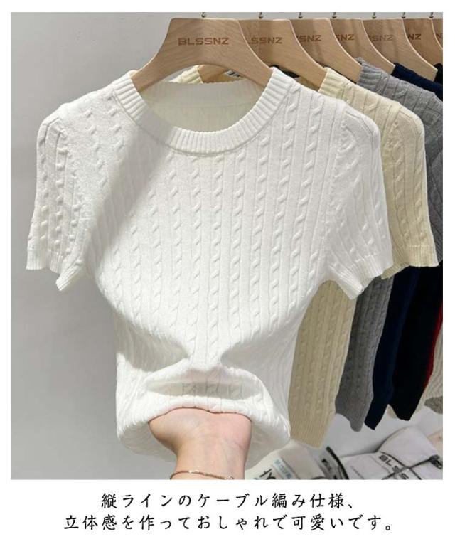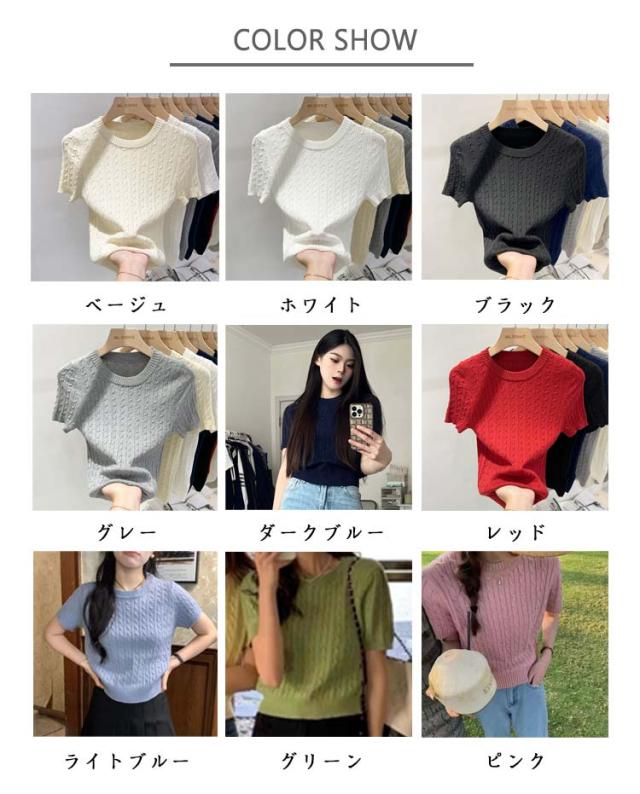 選べる9色 ニット セーター レディース 半袖 サマーニット トップス クールネック 通気 薄手 ケーブル おしゃれ 可愛い 伸縮性 ゆる感 柔らか プルオーバー カットソー 普段着 通勤 オフィスカジュアル 細見え 着痩せ 夏