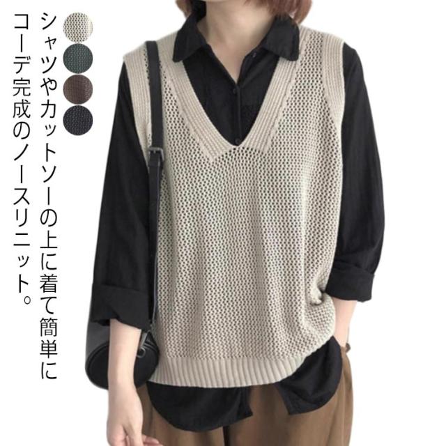 透かし編み ニット ベスト レディース 春夏 ニットベスト ニットジレ Vネック チョッキ シアー シアーニット プルオーバー おしゃれ 重ね着 レイヤード ノースリーブ クルーベスト セーター ゆったり 冷房対策 無地 シンプル 体型カバー カジュアル 20代 30代 40代 50代 60代