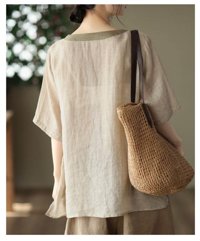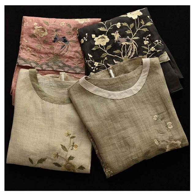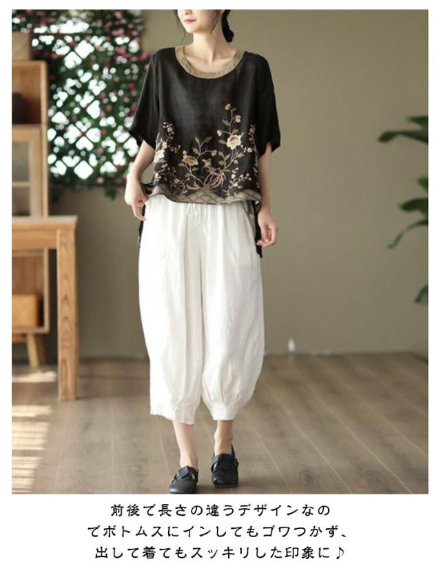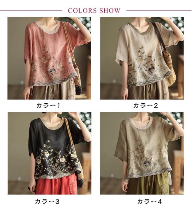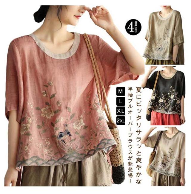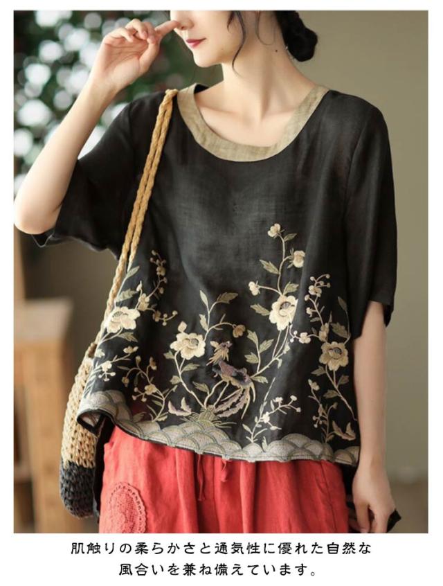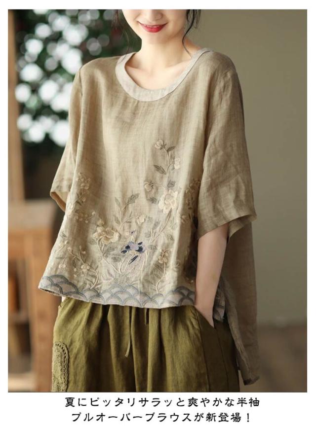 ブラウス 半袖 綿麻混 花柄 刺繍 フラワー 綿麻 ブラウス Tシャツ シャツブラウス 半袖 カットソー レディース プルオーバー コットンリネン 花柄 トップス 5分袖 ラウンドネック 花刺繍 チュニック カットソー シャツ シンプル リネン 麻 夏 薄手