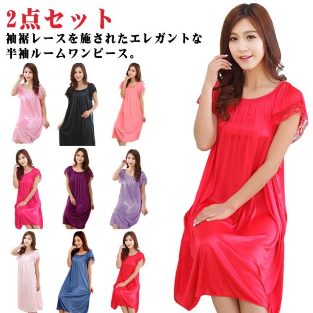 2点セット ルームワンピース 半袖 レディース 夏 レース袖 ルームウェア ワンピース 半袖ネグリジェ パジャマ ワンピース 春夏 ナイトウェア おしゃれ 大人 可愛い かわいい 大きいサイズ ゆったり 涼しい