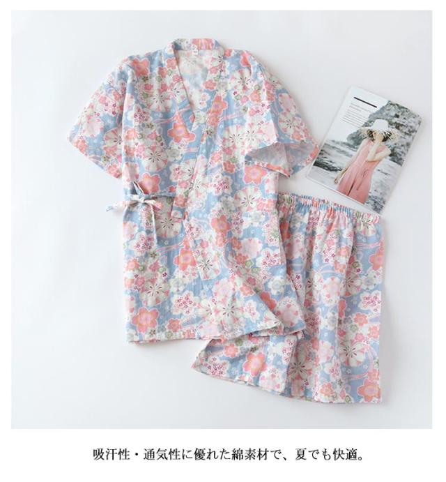 甚平 春夏用 かわいい花柄 レディース 作務衣 綿 Vネック 上下セット ショートパンツ 浴衣 レディース パジャマセット 半袖 ルームウエア ナイトウエア 無地 薄手 和風 2重ガーゼ 寝巻き 部屋着 ゆったり カジュアル 女性用 入院