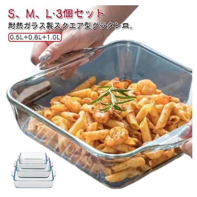 | 耐熱ガラス製スクエア型グラタン皿。【0.5L+0.8L+1.0L】【S、M、L?3個セット】 硬く滑らかな質感の耐熱ガラスは匂いや汚れも落ちやすく、お手入れしやすいのも嬉しいポイント。 グラタン等のグリル料理や、お菓子作りにもぴったりです。 オーブン・電子レンジで使用できます。食器洗い乾燥機・熱湯洗浄もOKです。 | |