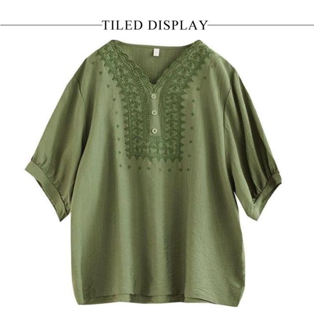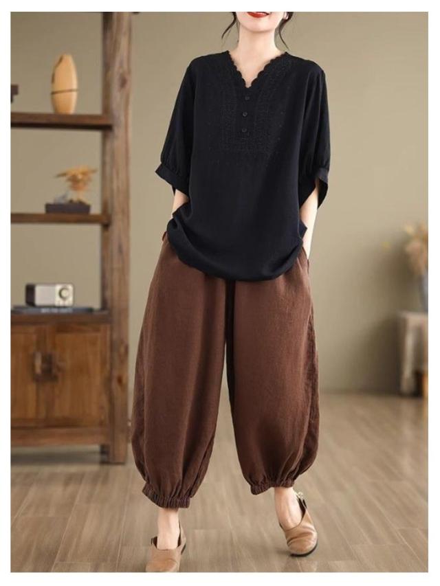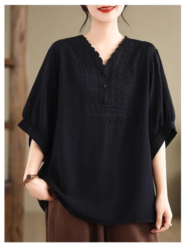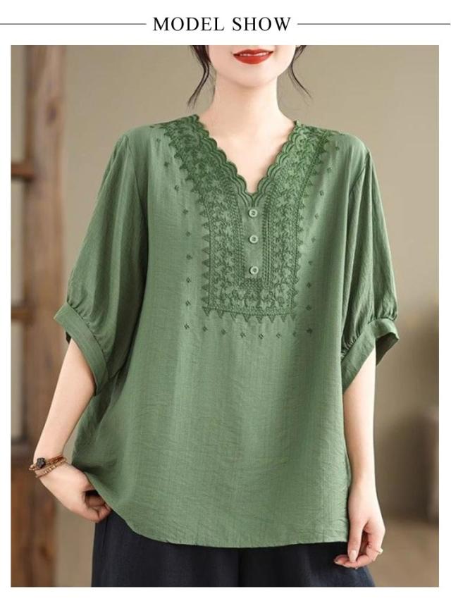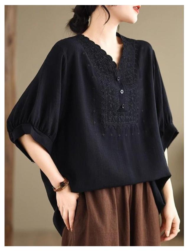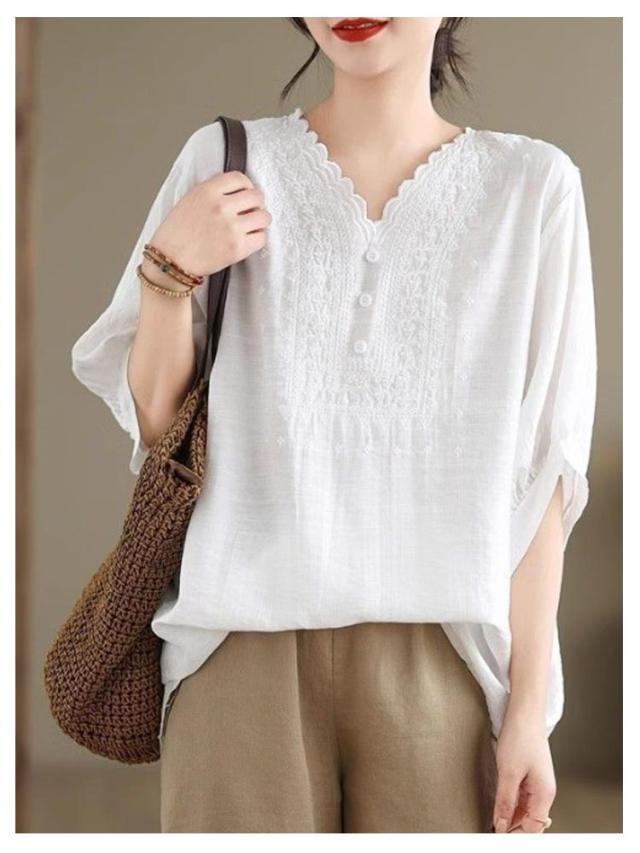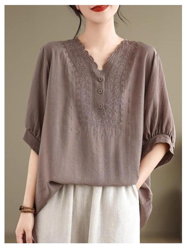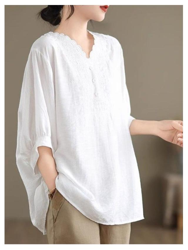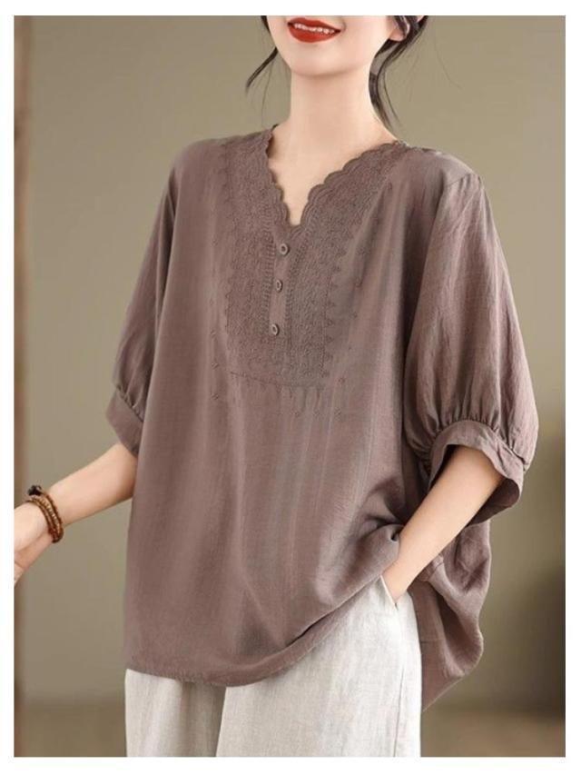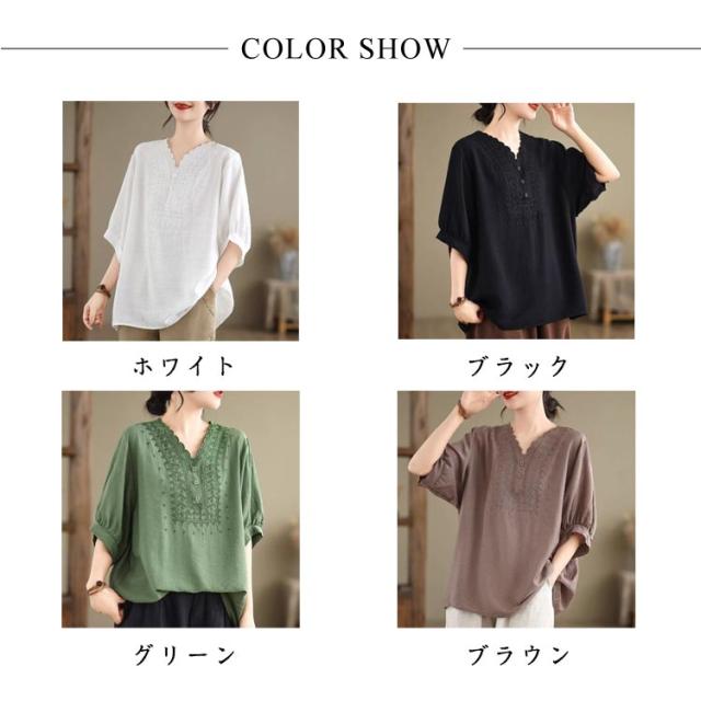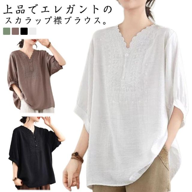 レディース 襟 五分袖 ブラウス プルオーバー Vネック レトロ Tシャツ シャツ 薄い 春夏 通勤 オフィス トップス ブラウス 体型カバー スカラップ 綿麻風 7分袖 ボリューム袖 韓国ファッション
